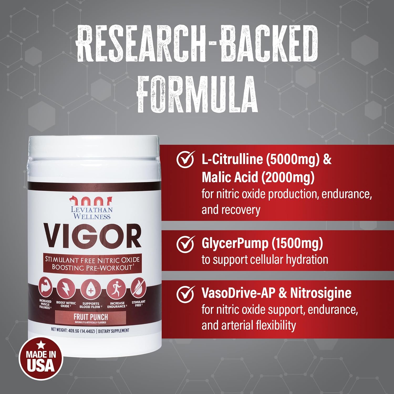 Vigor - Stimulant-Free Nitric Oxide Pre-Workout Powder | L-Citrulline (5000Mg), Malic Acid (2000Mg), Glycerpump (1500Mg)| Fruit Punch| 30 Servings, 13.86G Each | Made In The Usa