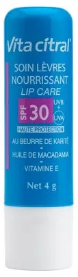 Vita Citral Nourishing Lip Care Spf30 4G Is A Balm Specially Formulated To Care For Dry, Damaged And Chapped Lips. With Shea Butter, Macadamia Oil And Vitamin E, It Nourishes And Soothes Lips. It Also Contains Spf30 Sun Filters For Uva And Uvb Protection. Lips Are Smoother, Softer And More Supple. Penetrates Quickly. Leaves No White Marks. Made In France