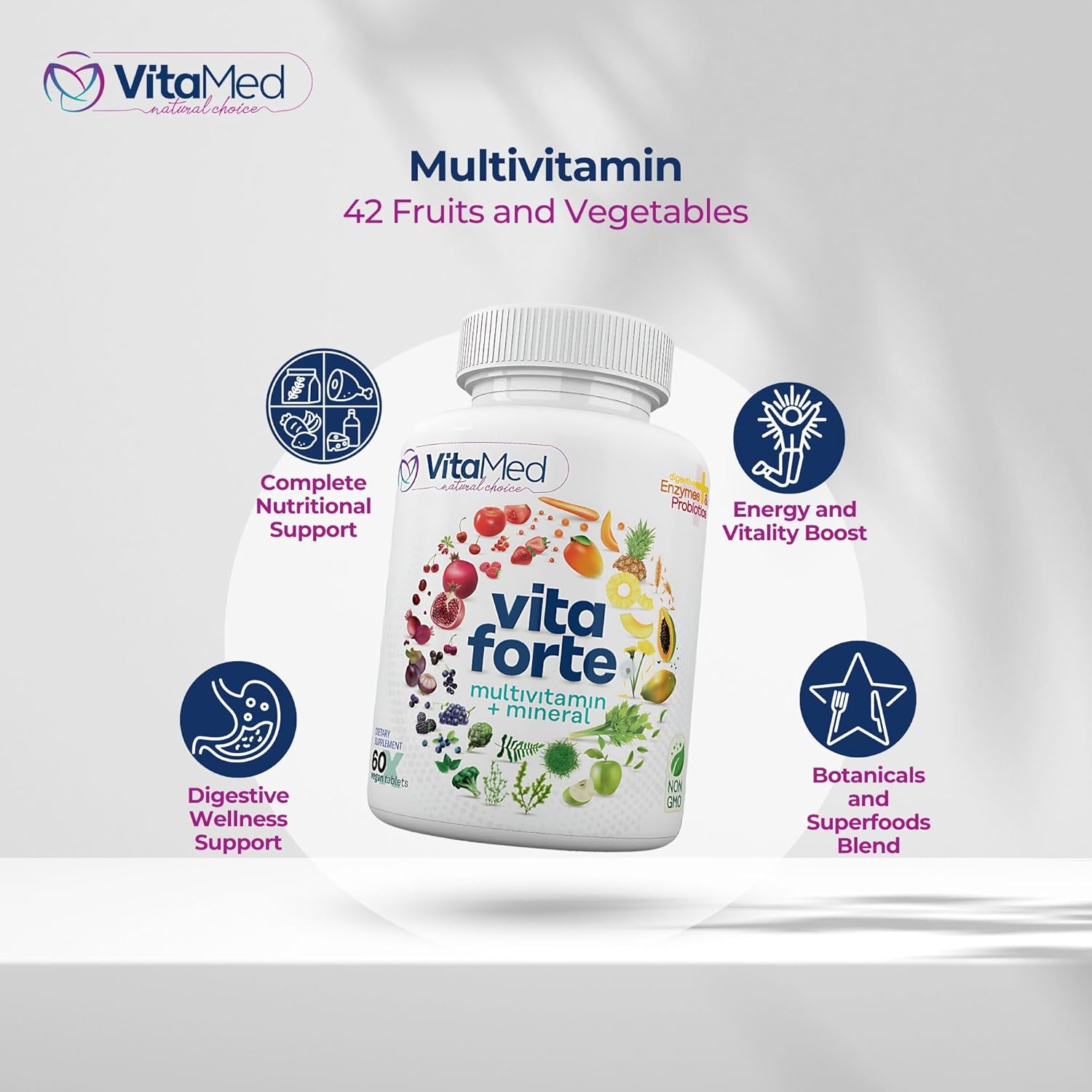 Vita Forte Vegan Multivitamin With Probiotics, Digestive Enzymes & 42 Fruits & Vegetables – Halal Certified, Non-Gmo, Gluten-Free, Daily Energy & Immune Support – 60 Vegan Tablets
