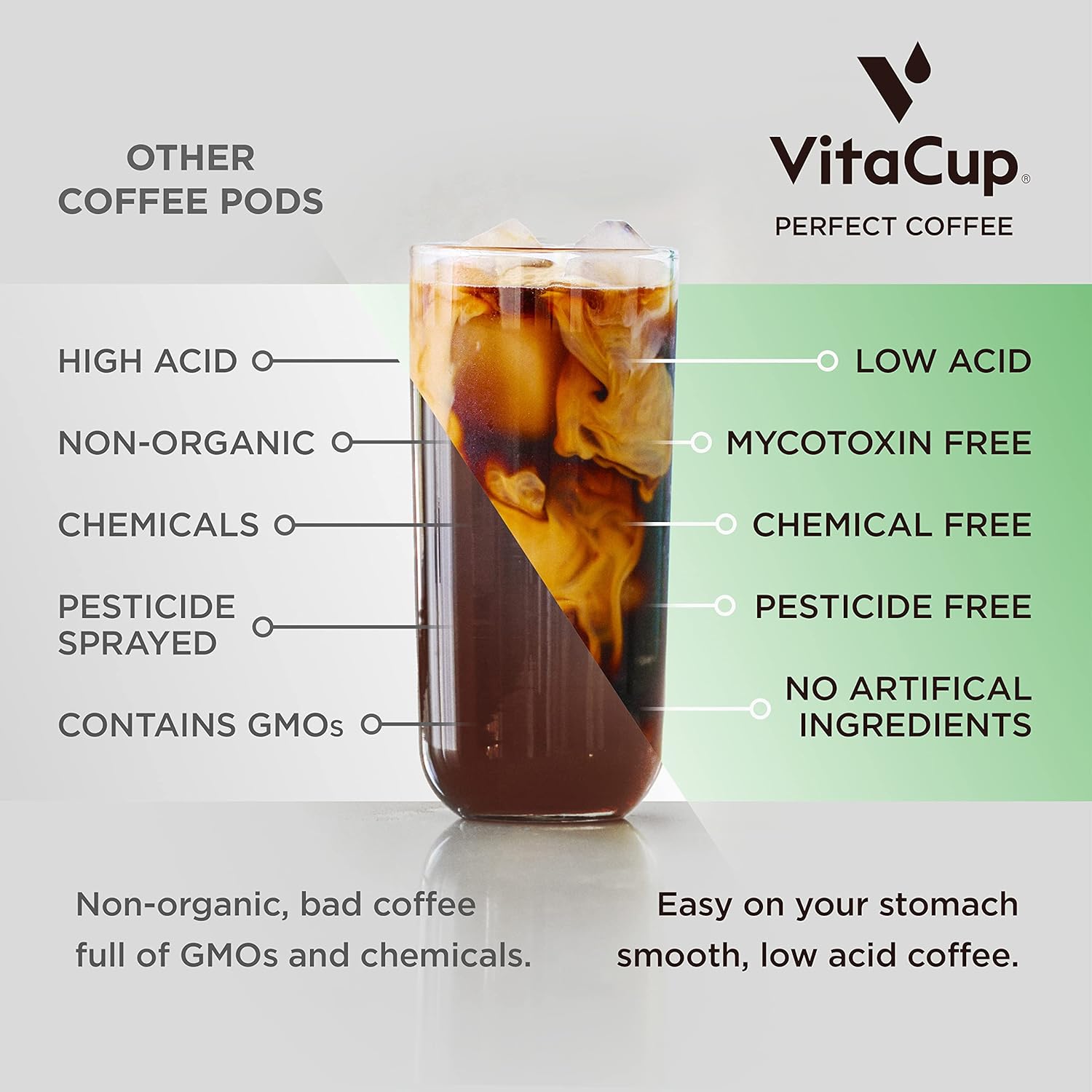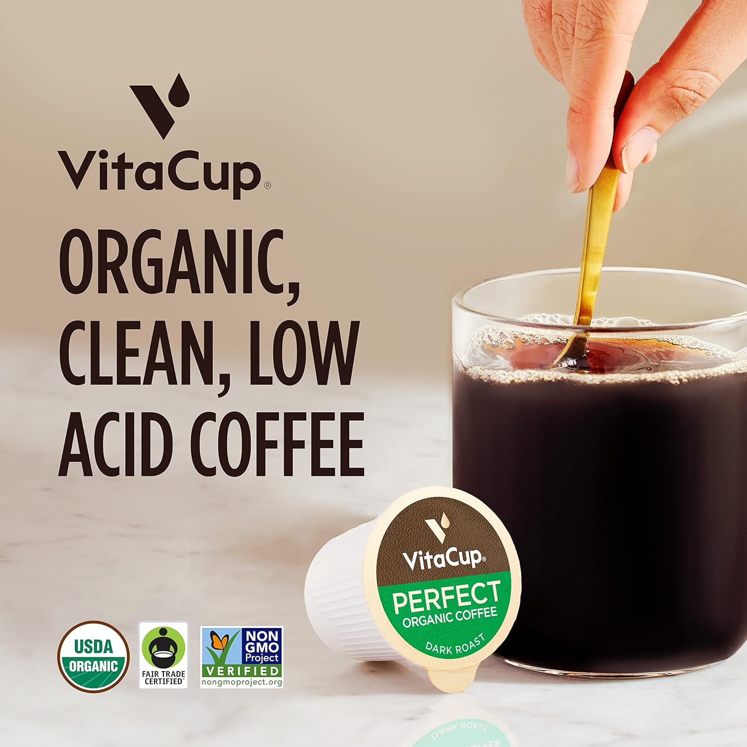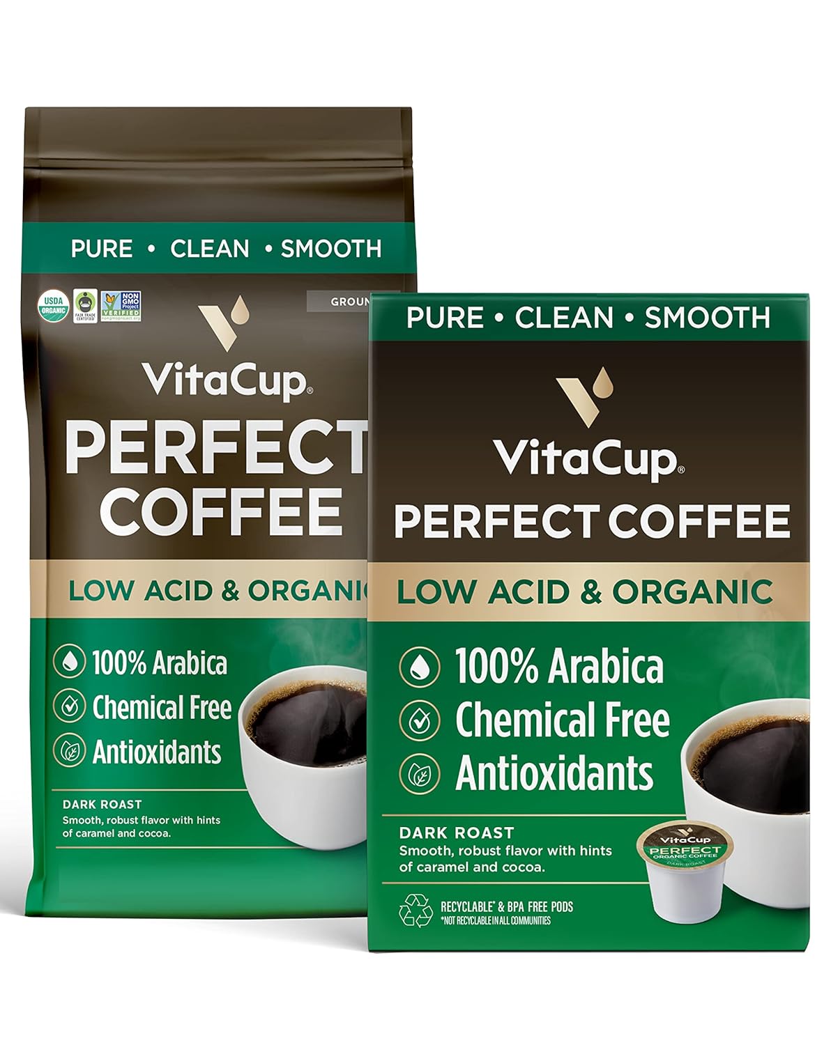 Vitacup Perfect Low Acid Coffee Bundle, Pure & Smooth Usda Organic & Fair Trade, Mycotoxin Free, Dark Roast | 24 Ct Pods & 11 Oz Organic Ground Coffee
