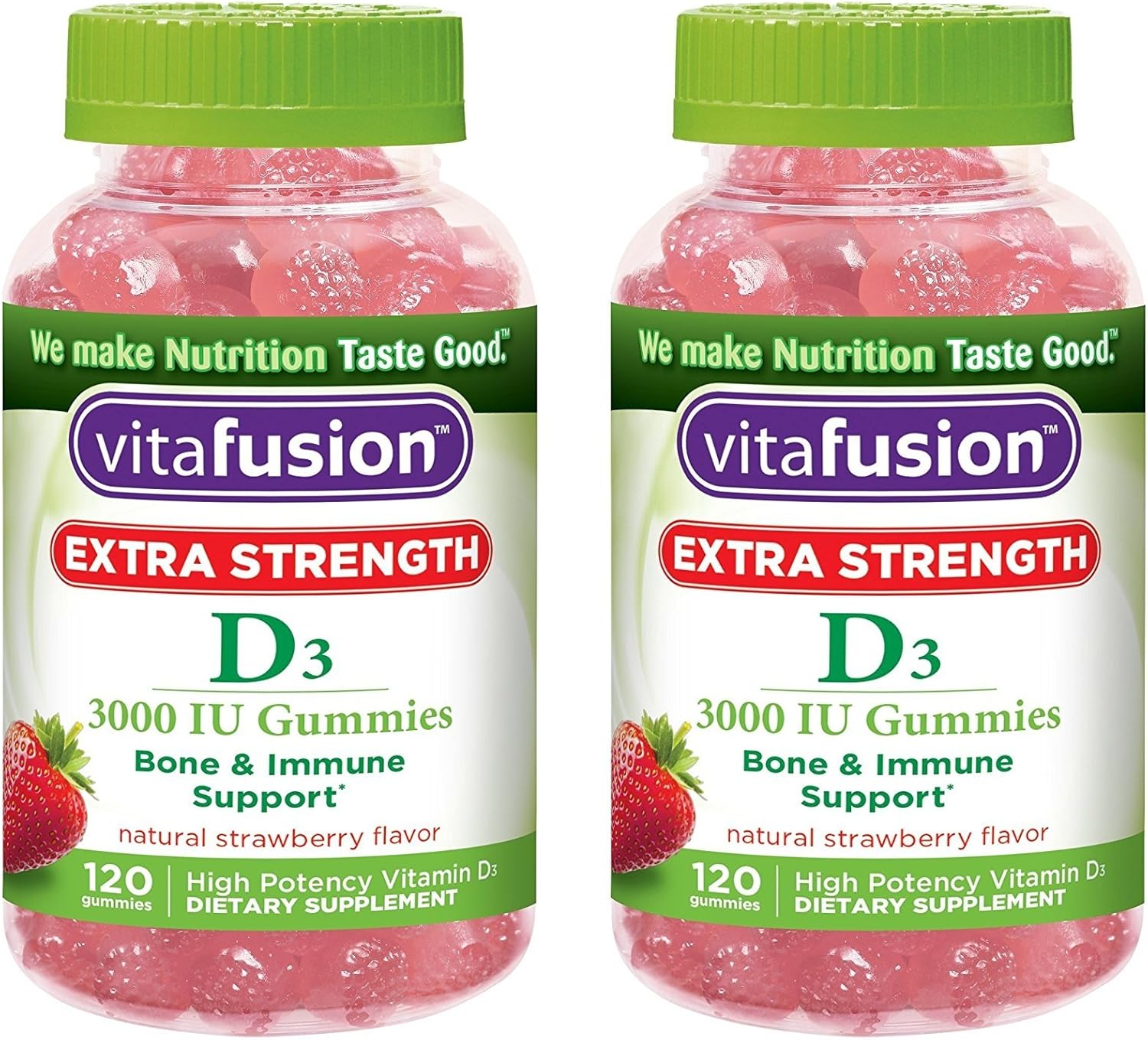 Vitafusion Extra Strength Vitamin D3 fuses delicious and nutritious. Two Extra Strength D3 gummies provide 75 mcg (3000 IU) - 375% daily value - of Vitamin D per serving