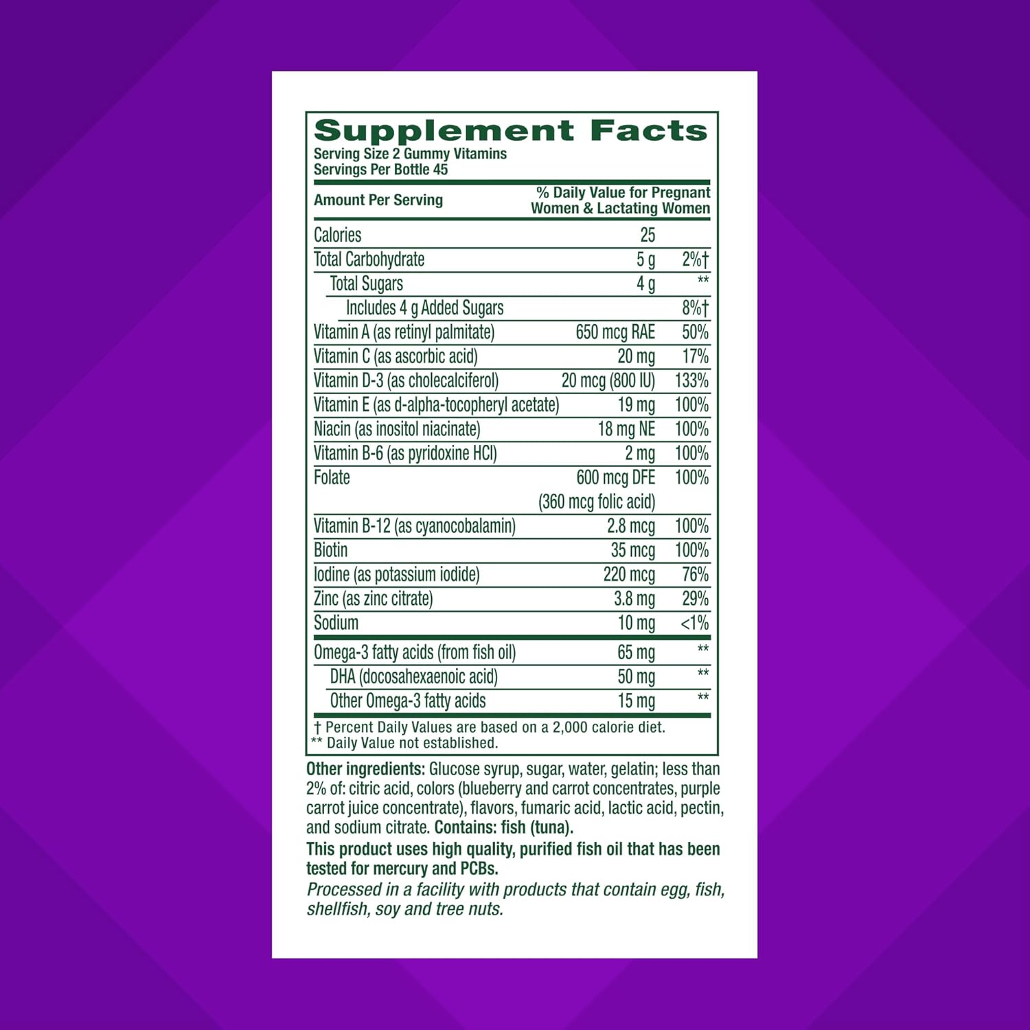 Vitafusion Prenatal Gummy Vitamins Are Formulated To Support The Specific Health Needs Of Women Before, During And After Pregnancy(1). Each Two-Gummy Serving Combines Pregnancy Vitamins For Women, Minerals And Natural Fruit Flavors To Provide A Convenient Alternative To Hard-To-Swallow Vitamin Pills. These Gummy Multivitamins Help Support Mom And Baby'S Everyday Health Needs (1) With 100 Percent Daily Value Of Folate And An Excellent Source Of Vitamin A, Vitamin C And Vitamin D. These Daily Vitamins Also Contain Biotin, Iodine, Zinc And Vitamins E, B6 And B-12, Along With 50 Mg Of Omega-3 Dha, An Important Nutrient For Pregnancy Health(1). With No Iron Added, These Multivitamin Gummies Are Easy On The Stomach (1). These Women'S Vitamins Are Made With No Artificial Flavors Or Sweeteners, Gluten, High-Fructose Corn Syrup, Dairy Or Synthetic Dyes. Each 90-Count Bottle Of Vitamin Gummies Has Enough For 45 Days Of Dietary Supplement. Take A Fruitful Step Toward A Healthier, Happier World With America’S Number-1 Gummy Vitamin Brand. (1) These Statements Have Not Been Evaluated By The Food And Drug Administration. This Product Is Not Intended To Diagnose, Treat, Cure Or Prevent Any Disease