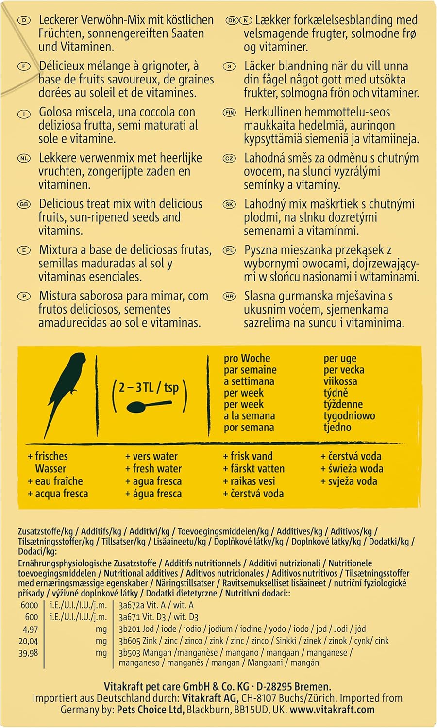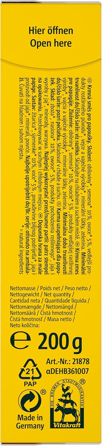 Vitakraft Fruitti Cocktail - 200g Single Packet A sugar free snack to supplemet primary food. A varied snack mix containing delicious fruits and sun-ripened seeds. The snacks also contain valuable vitamins - a crunchy treat!