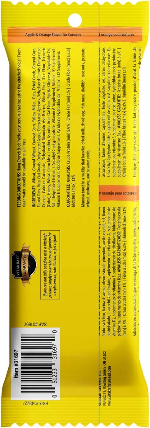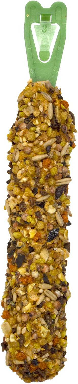 Vitakraft Glazed Sticks For Conures Are A High Quality Harvest Apple And Orange Treat Stick That Your Bird Will Find Irresistible. Containing Only Top Quality Ingredients Such As Specially Selected Seeds Plus Vitamins And Minerals. Every Vitakraft Treat Stick Has A Wooden Core Which Is Dipped In A Calcium And Mineral Rich āBatterā, Coated With Seeds And Grains And Then Baked. This Process Is Repeated At Least Three Times. The Result Is A Very Long Lasting, Triple Baked Treat That Is As Nutritious As It Is Fun For Your Pet. When The Seed Is All Gone, The Small Animals Enjoy Nibbling On The Wooden Core As Well. Includes A Clip Holder Which Clips Easily To The Cage For Hassle Free Dispensing