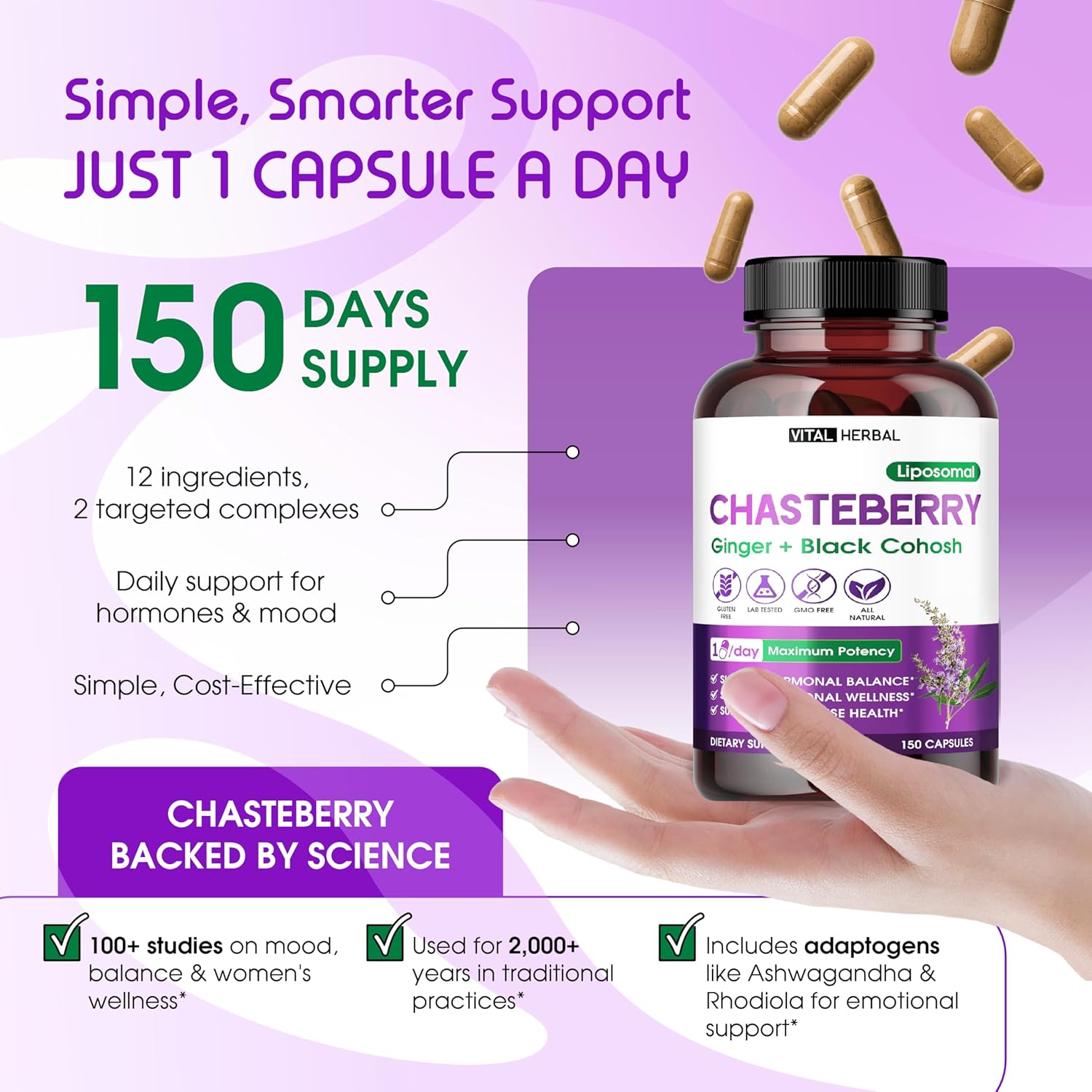 Vital Herbal Liposomal Chasteberry With Ginger & Black Cohosh – Supports Hormone Balance, Emotional Wellness & Menopause Health – 150 Capsules – Made In The Usa