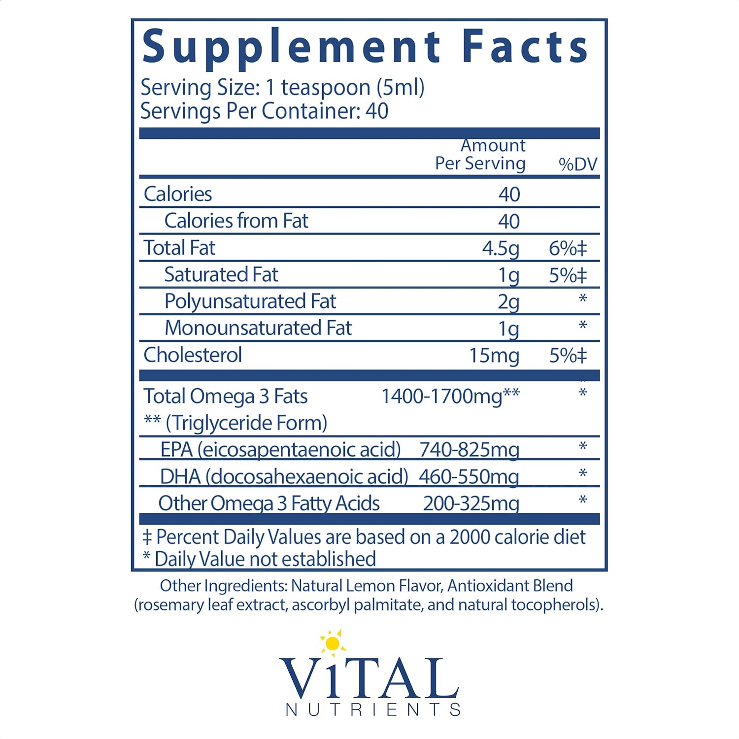 DESCRIPTION : Vital Nutrients - Ultra Pure Fish Oil 1400 (Pharmaceutical Grade) - Deep Sea Liquid Fish Oil, Cardiovascular Support, Natural Lemon Flavor - 200 ml per Bottle