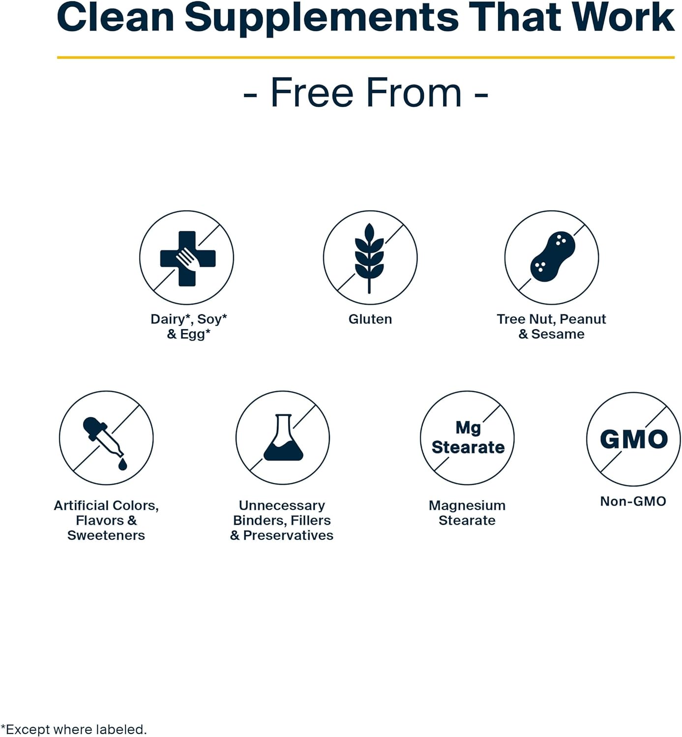 Clean Vegan Formula: Free from gluten, dairy, peanut, tree nut, fish, shellfish, soy, sesame, and egg. Non-GMO. Made without artificial fillers, coatings, binders, or colors