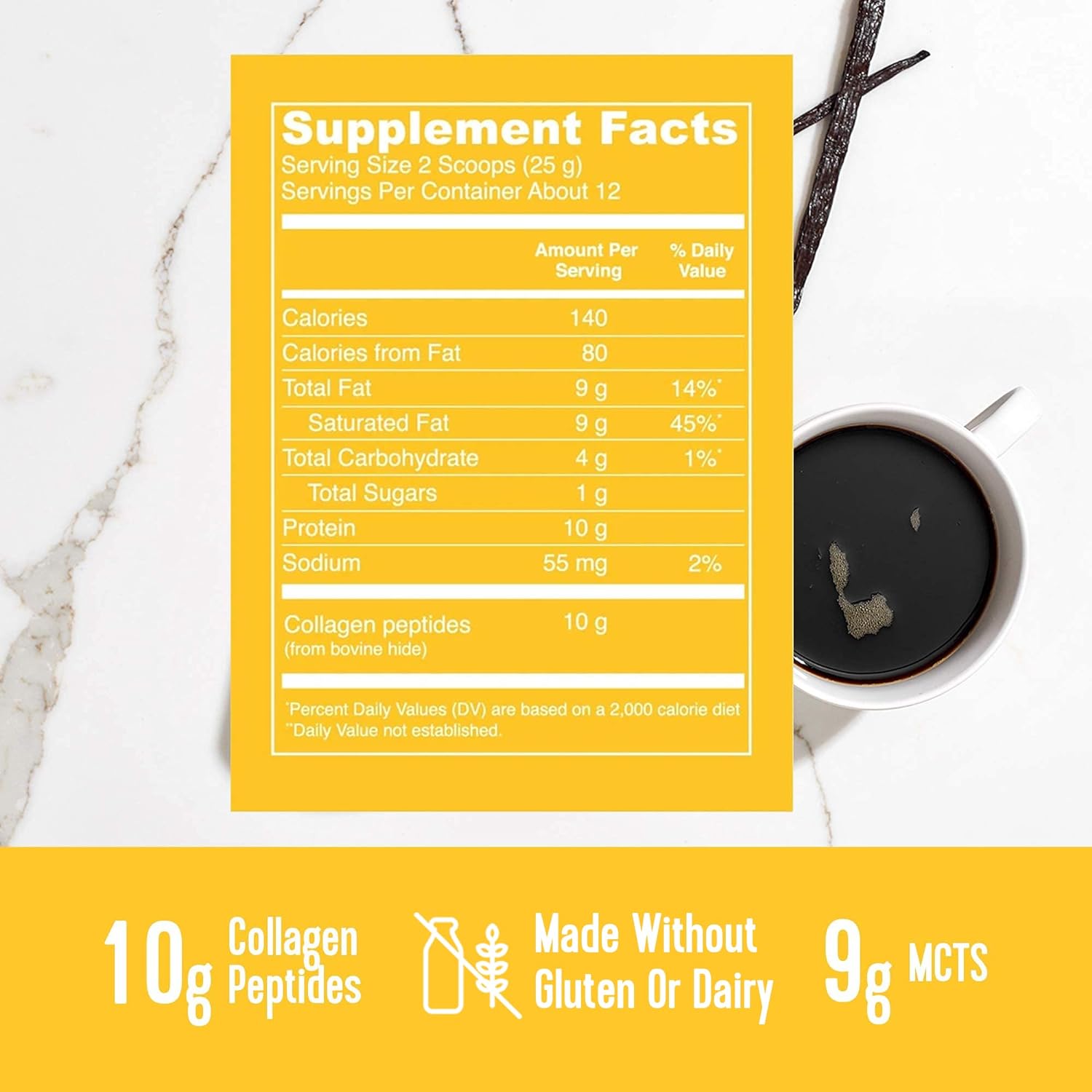 Non-Dairy Coffee Creamer ---- A delicious, dairy-free creamer alternative boosted with collagen nutritionEnergy-Boosting MCTs ---- Our Collagen Creamer includes 9g of Medium Chain Triglycerides (MCTs), a type of healthy fat found in coconut milk. It's great for energy production.** FYI, coconut is an excellent source of MCTs. That's also why it tastes like coconutKey Nutritional (per serving) ---- 10g of collagen per creamers. Our Collagen Creamer combines our signature grass-fed & pasture-raised bovine Collagen Peptides and energy-boosting MCTs for a delicious way to elevate your cup of joy, while supporting healthy hair, skin, nails & joints** as you goHealth Truth ---- Our collagen creamers are made without dairy, gluten, paleo friendly, keto friendly, whole30 approved, and free of any added sugars. You'll notice there is just 1g of sugar per serving that is found naturally in the coconut milk powderNow for the Delicious Goodness ---- Add our Collagen Creamer to coffee for a sweet addition to your morning routine or mix it into granola or cereal for a unique spin on your favorite breakfast staples