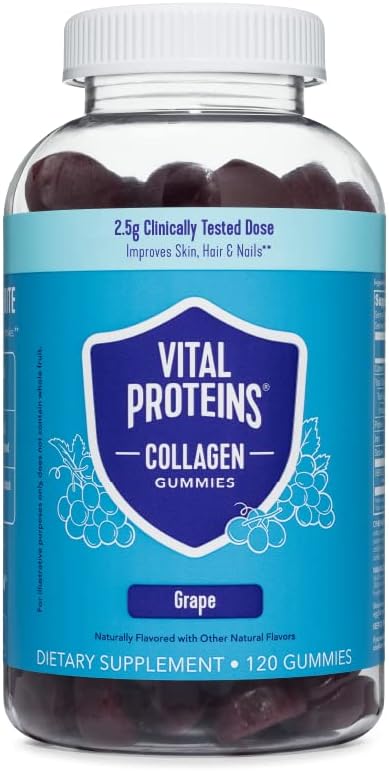 Clinically Tested Dose --- Vital Proteins Collagen Gummies is a supplement featuring a clinically-tested dose of collagen that reduces fine lines and wrinkles, supports hair and nails, and increases skin elasticity2.5g VERISOL Collagen Peptides --- VERISOL bioactive collagen peptides stimulate the fibroblast cells in the dermal layer of the skin to increase their collagen production and overall helps combat what is lost through aging and environmental influencesNatural Grape Flavor, Great Taste --- Shield your wellness with our convenient, delicious, grape-flavored Collagen Gummies. The non-GMO canola oil enhances the overall gelatin structure of the gummy and improves its texture/mouthfeel!Dietary Compliant ---- Made without gluten, dairy, & soy. Free of synthetic colors and artificial flavorsHow To Use ---- Just take 4 Collagen Gummies each day at anytime, as part of your daily wellness regimen