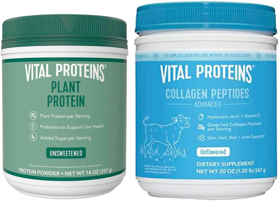 Vital Proteins Collagen Peptides Advanced is a premium offering with 20g collagen peptides per serving plus two additional functional ingredients – 100% daily value vitamin C and 80 mg hyaluronic acid. Vitamin C helps to support the body’s natural collagen production while hyaluronic acid helps to improve skin hydration and joint mobility.**^ Our product quantity is based on weight, not canister sizeEasy To Use: One serving a day of Vital Proteins Collagen Peptides Advanced is easily digested and dissolves in cold or hot liquids, like coffee, tea and smoothiesSame Product You Love, Packaging May Vary: While we are going scoopless, the recommended dosages will stay the same. We encourage consumers to follow the measurement guidance on our updated label which provides servings measured in tablespoons20g plant protein per serving including all 9 essential amino acids – Adding one serving of Plant Protein to your post-workout routine or daily nutrition so you can truly thriveVegetarian – Made with plant-based diets in mind. Developed without dairy, gluten, or soy. No added sugar - made with a hint of stevia, Plant Protein contains 0g of added sugar per servingVital Proteins Collagen Peptides Powder 20 oz Unflavored + 14 oz Unsweetened Plant Protein Powder