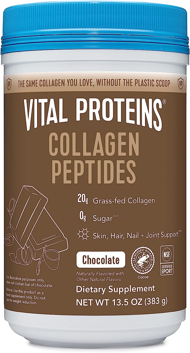 Delicious Chocolate Collagen Peptides: The same grass-fed, pasture-raised collagen you know and love, but with an added flavor boost from alkalized cocoa powder and a touch of steviaHealth Benefits: Supports healthy hair, bones, joints, and nails. Collagen also boosts workout recovery by supporting healthy muscles, tendons, bones and jointsEasy to Use: Combine 4 tbsp with 8 fl oz water, mix thoroughly. For best results, use a shaker cup or blenderCertifications: Made with 0g of added sugar^^,made without gluten / soy / dairy. Paleo & keto friendly, Natural chocolate flavor20g Collagen Powder Per Serving: While we are going scoopless, the recommended dosages will stay the same. We encourage consumers to follow the measurement guidance on our updated label, which provides servings measured in tablespoons