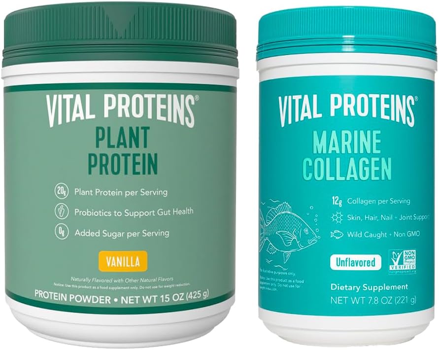 Bioavailable Collagen Peptides Powder ---- Our Marine Collagen is made from the scales of fresh, non-GMO, wild-caught white fish off the coast of Alaska. It’s highly bioavailable, digestible and soluble in cold waterHealth Beneficial ---- Marine collagen peptides can be digested and absorbed by the body quickly for maximum benefits. Helps improve the health of your hair, skin, nails, joints and ligaments, and tendons12g Collagen Powder per Serving ---- We provide a scoop to measure it, which 2 scoops of powder = 12g. That's also why the container isn’t full and just has to leave room for the scoop. And our product quantity based on weight, not canister size20g plant protein per serving including all 9 essential amino acids – Adding one serving of Plant Protein to your post-workout routine or daily nutrition so you can truly thrive. 1B CFU Probiotics support a healthy gut and ease digestionVegetarian – Made with plant-based diets in mind. Developed without dairy, gluten, or soy. No added sugar - made with a hint of stevia, Plant Protein contains 0g of added sugar per servingVital Proteins Marine Collagen Peptides Powder 7.8 oz Unflavored + 15 oz Vanilla Plant Protein Powder