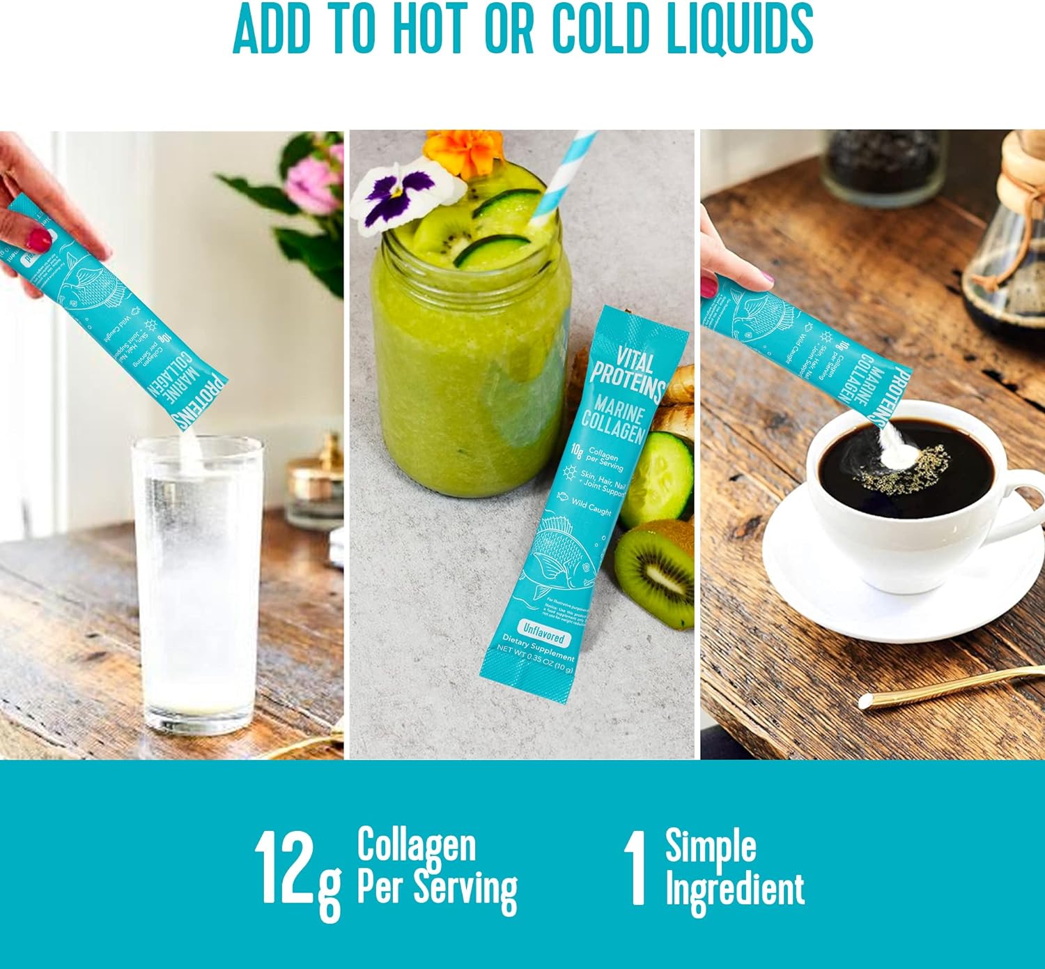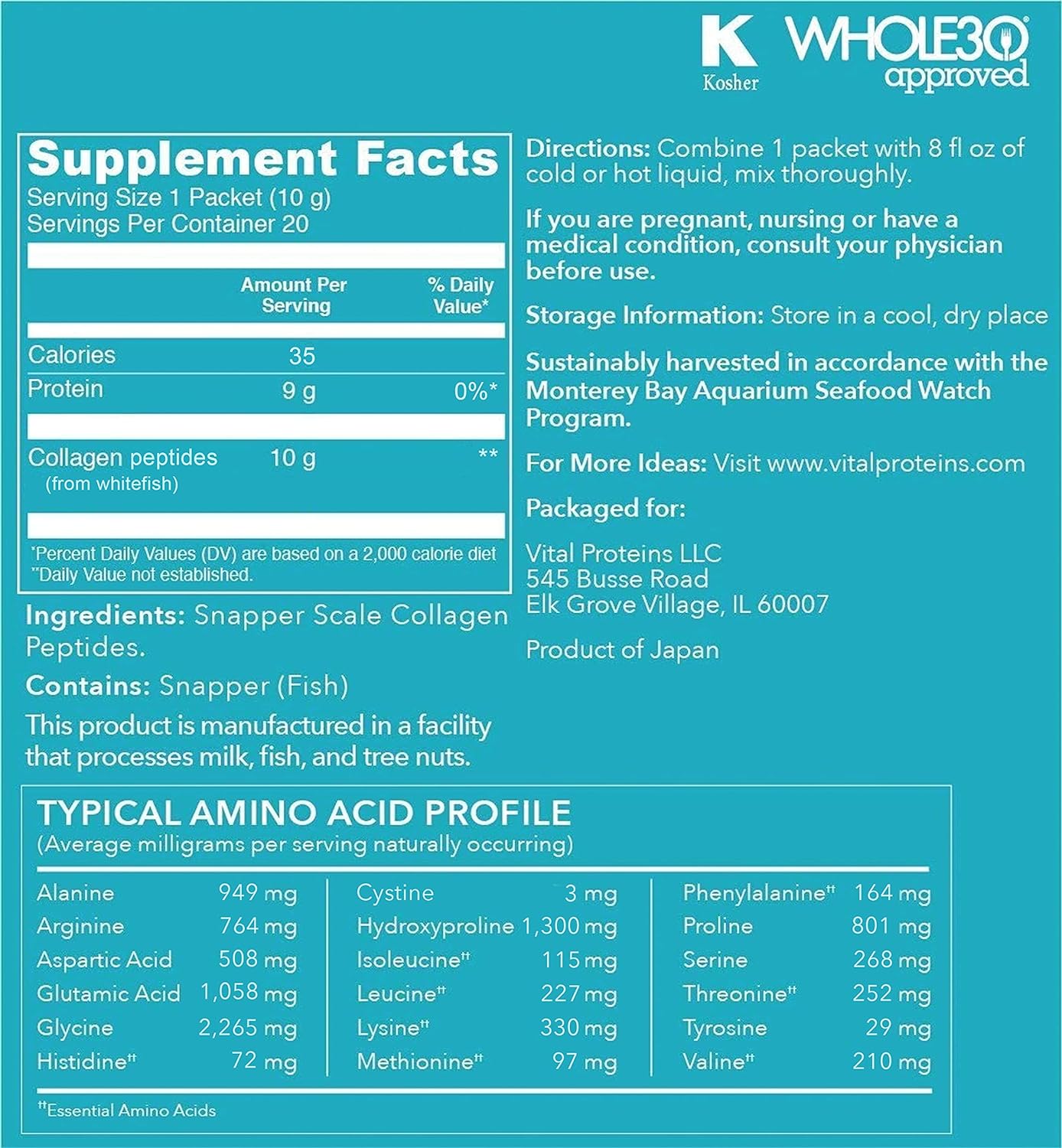 Bioavailable Collagen Peptides Powder ---- Our Marine Collagen is made from the scales of fresh, non-GMO, wild-caught white fish off the coast of Alaska. It’s highly bioavailable, digestible and soluble in cold waterHealth Beneficial ---- Marine collagen peptides can be digested and absorbed by the body quickly for maximum benefits. Helps improve the health of your hair, skin, nails, joints and ligaments, and tendonsEasy to Use ---- Soluble in hot or cold liquids, including coffee, smoothies, and tea. 1-2 packs a day is all you need! It can be taken in the morning, afternoon or in the eveningDietary Compliant ---- Paleo Friendly & Whole30 Approved. For pescatarian. No added sugars or sweeteners. Made without gluten / cholesterol / mercury / dairy. FlavorlessTravel Size ---- Convenient taken-with stick packets containing 20 packets per box, which 10g of collagen per pack