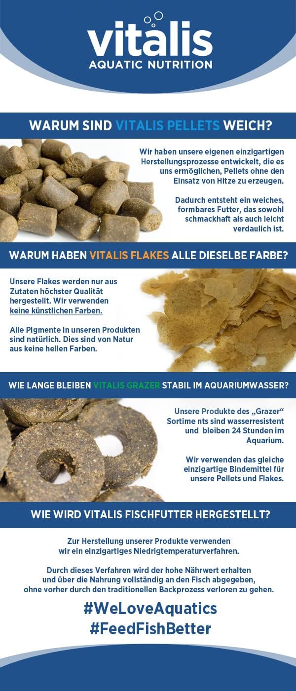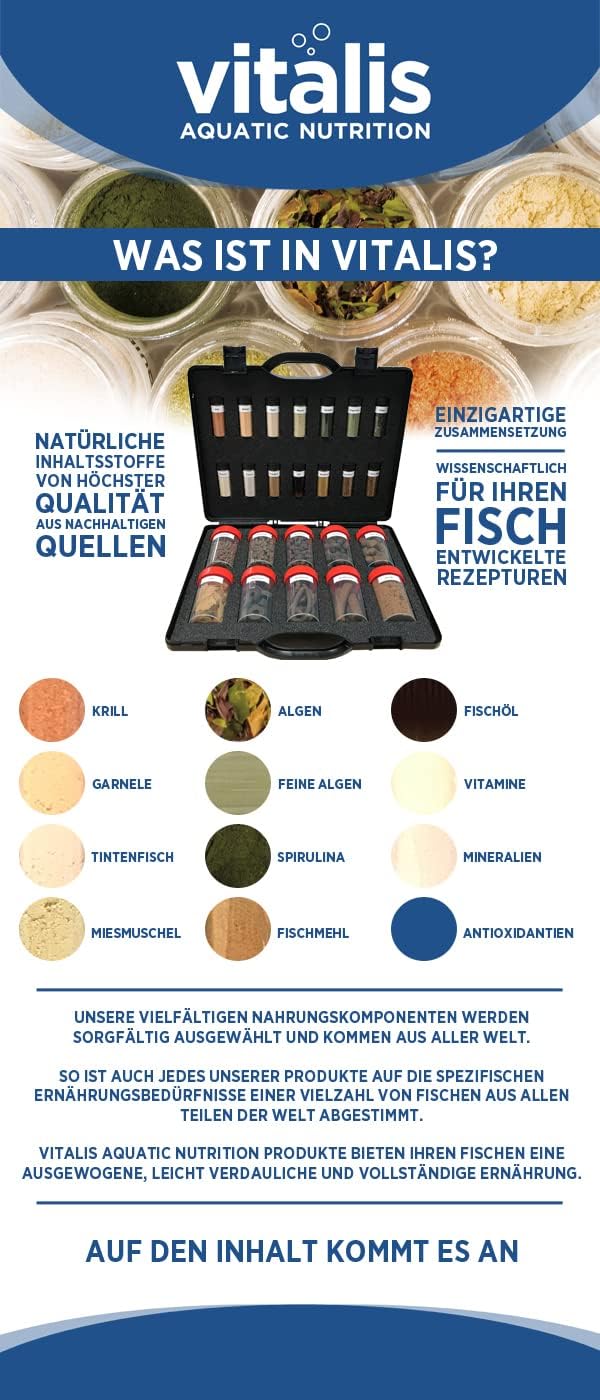 About The Product : Highly digestible and balanced fish food β the Vitalis Aquatic Nutrition flakes fish food embodies a highly digestible and balanced diet for sea and aquarium inhabitants with delicious flavours. Choose between flakes for community aquariums, pellets for hobby aquariums at home and grazers that remain in the water for a whole day