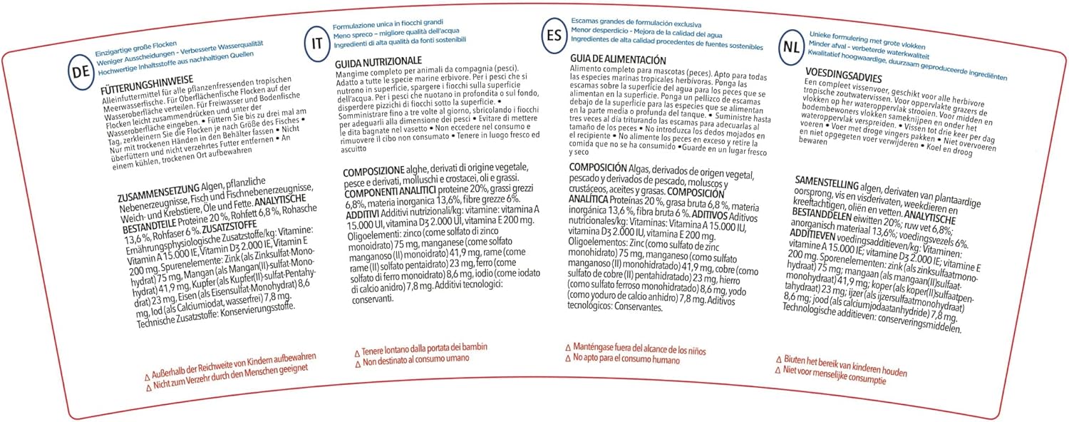 Are you looking for a highly digestible and balanced fish food to promote the health of marine fish species or herbivorous sea animals Then you have found the perfect nutrient formula for optimal fish food with our marine algae flakes. You will receive a high-quality fish food in the form of flakes for communal aquariums, pellets for the home and grazers, which are suitable for willow fish species and are preserved throughout the day. Combine essential nutrient components adapted to the species, such as algae, squid, shrimp and shells, with an optimal ratio of individual vitamins and minerals. Contribute to a healthy and beautiful colour of the fish with natural pigments and create a clear and healthy habitat for your fish with the naturally dissolving fish food. With the help of our own production, we can ensure the quality and purity of the products and develop a suitable and nutrient-rich fish food for each species to meet the needs of every aquatic creature. Once again all the advantages at a glance: Perfect for herbivorous sea creatures Choice of flakes, pellets and grazers Essential components of algae, squid, shrimp and shells Balanced ratio of vitamins and minerals. Natural pigments for healthy colouring. Clear and healthy water without residue Coverage all nutrient needs Get the Marine Algae Flakes Aquarium Fish Food now!,Highly digestible and balanced fish food β the Vitalis Aquatic Nutrition flakes fish food embodies a highly digestible and balanced diet for sea and aquarium inhabitants with delicious flavours. Choose between flakes for community aquariums, pellets for hobby aquariums at home and grazers that remain in the water for a whole day,ESSENTIAL NUTRIENTS AND VITAMINS - All our products in the Marine, invertebrates, Tropical and Coldwater range have individual core components of algae mixtures, squid, shrimp, crille and shells, providing all types of sea creatures with important nutrients. Choose from up to 21 products to suit your aquarium,Perfect for herbivorous sea creatures - Marine Algae Flakes provide your fish with a high quality food source with valuable proteins from a blend of molluscs and crustaceans. In addition, the fish food includes a balanced ratio of vitamin A, D3, E and the minerals zinc, manganese, iron, iodine and copper,Natural pigments and clean water - In addition to the unique ratio of vitamins and minerals, the fish are supplied with natural pigments that ensure a healthy and beautiful colour of the outer skin. The Marine Algae Flakes can be used in rotation with the Platinum Marine products and dissolve naturally after a period of time without leaving any residue,We meet the needs of your fish - choose between different types of food and product sizes and get the optimal fish food for the needs of any sea creatures. With our own production and specially developed feed ortments for individual species and large aquariums with several species, we can cover any nutrient needs