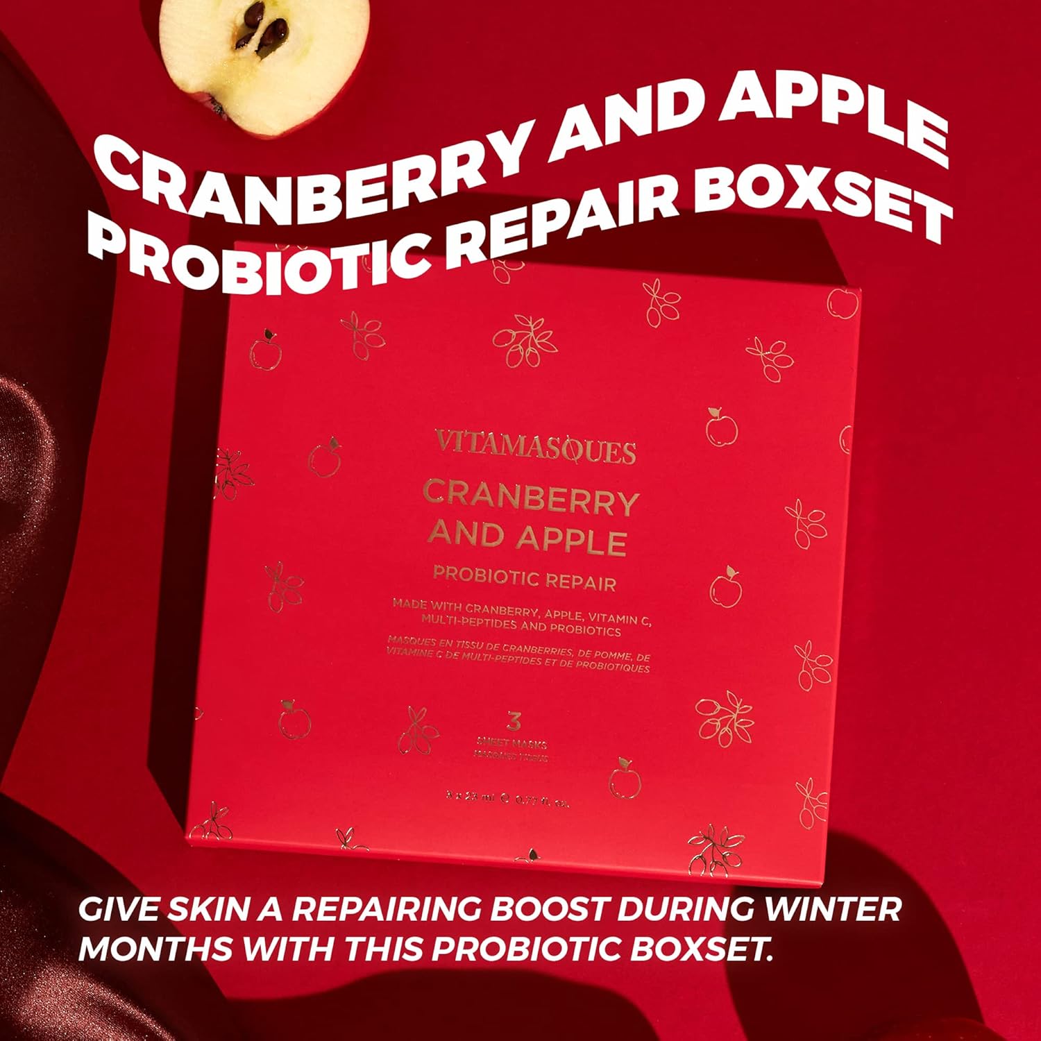 FACE MASK BOXSET: The Cranberry and Apple Probiotic Repair Boxset is a vegan-friendly face sheet mask boxset with a set of 3 face masks made with premium extracts to give skin a repairing boost during winter months. Includes 3 face masks