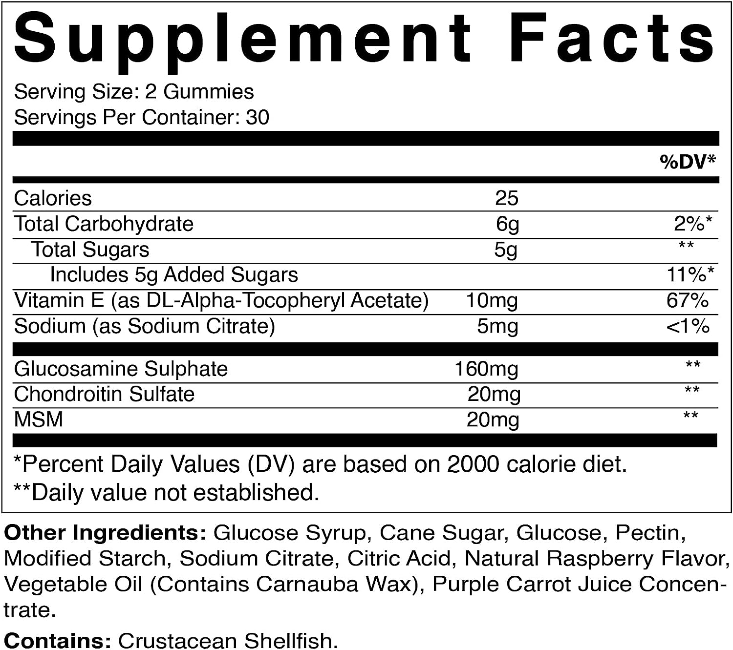 Delicious Natural Raspberry FlavorHigh Quality Glucosamine Chondroitin MSM Gummies - Supports Joint Mobility & FlexibilityNon-GMO formula - Gluten FreePectin Based - Gelatin FreeFree of starch, soy, yeast, wheat, egg, artificial color, flavor, & preservatives