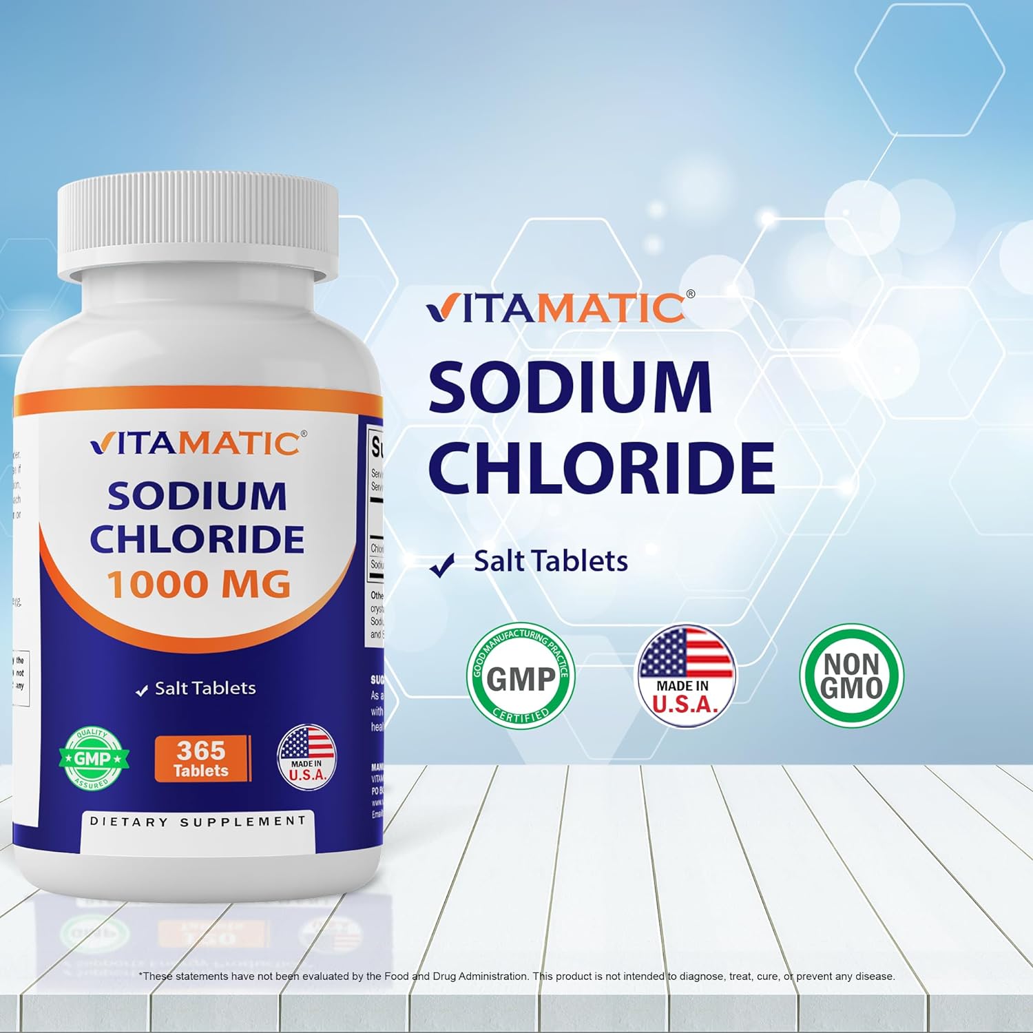 Made with USP Grade Sodium Chloride to Prepare Normal Isotonic SolutionAn Electrolytes Replenisher Hydration DrinkSodium Chloride Tablets Work Quickly to Combat or Prevent Sodium DepletionMade in the USA with Strict GMP standardsWarning: Taking salt tablets orally may cause nausea and stomach upset. To avoid, make sure you drink plenty of water or other beverage when taking one of these pills. If your mouth starts salivating and you keep spitting you need to get something to drinkVitamatic Sodium Chloride 1000mg, 365 Tablets - Salt Tablets, Non-GMO, Gluten Free - Electrolytes Replenisher Hydration Drink