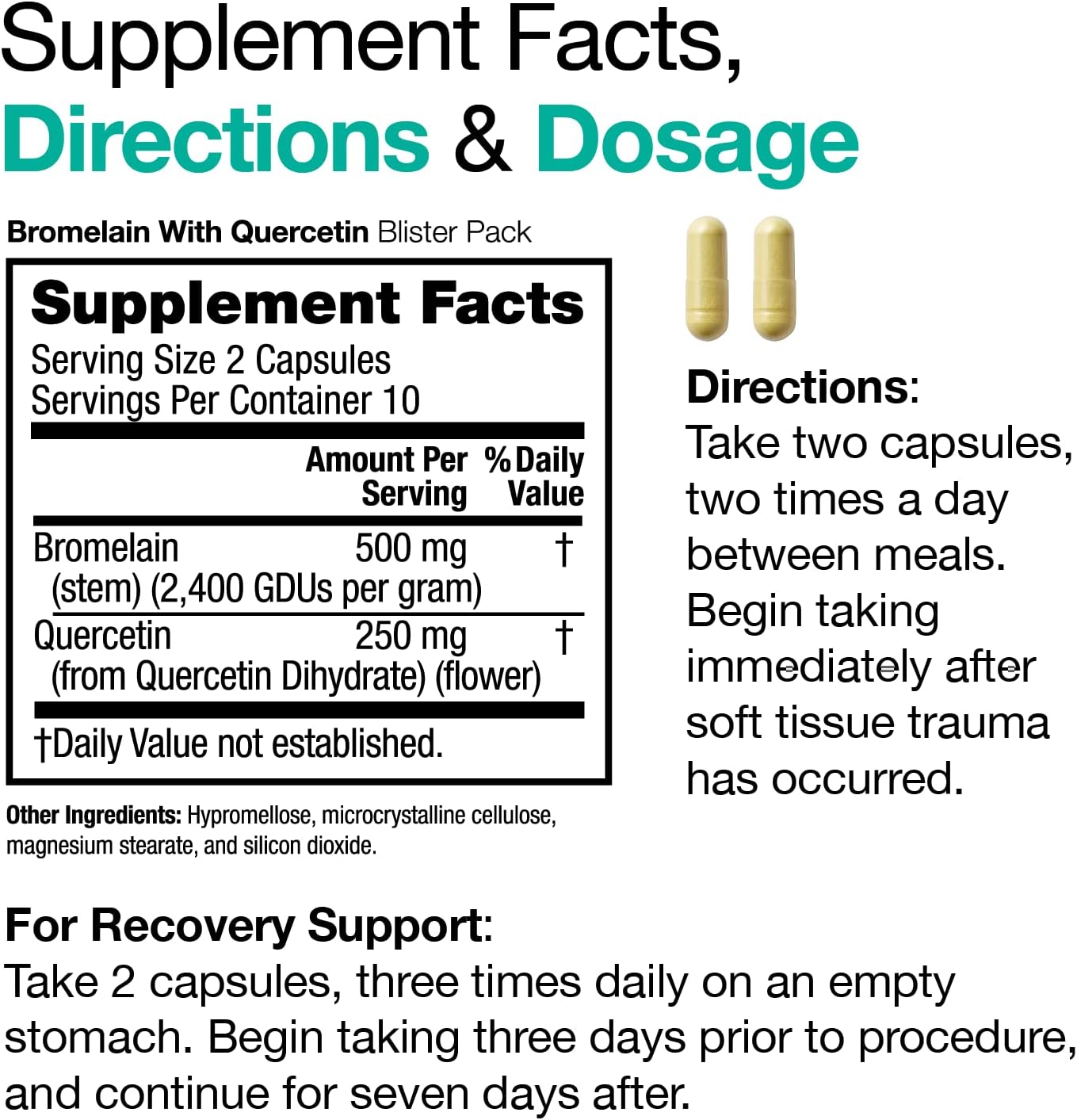 Bromelain With Quercetin Works Better: Surgeons And Other Professionals Love Our Bromelain Quercetin Supplement. We Use Pure Bromelain And The Best Quercetin. Together, They Support Healthy Tissues Better Than Bromelain Cream Or Bromelain Tablets. Concentrated Bromelain Supplement: Our Science Backed Bromelain Capsules Deliver 2400 Gdus Per Gram Of Enzyme Activity. Studies Show Taking At Least 2000 Gdus Per Gram Is How To Benefit From Bromelain, And Pineapple Extract Pills Don’T Have Enough. Bromelain For Bruising And Swelling: Bromelain And Quercetin Are Botanicals With A Long History Of Use For Help With Sore Muscles, Joints, Bruising, And Swelling. Ideal Quercetin With Bromelain Supplements For Recovery Support From Soft-Tissue Injury. Simplify Your Healing: Get Quercetin 500 Mg With Bromelain 2400 Gdu 500 Mg In One Easy Solution. Try Our Best Bromelain Supplement Designed By Our Founder Dr. David H. Rahm To Support You Through Recovery And Help Get You Back On Your Feet Faster. Double Saver Bundle: Afraid Of Running Out Stock Up And Save With Our Value Bundle And Get 2 Bottles Of Our Popular Bromelain Quercetin Supplements. Total Bundle Count Delivers 120 Super Bromelain Capsules To Support Your Recovery And Wellness