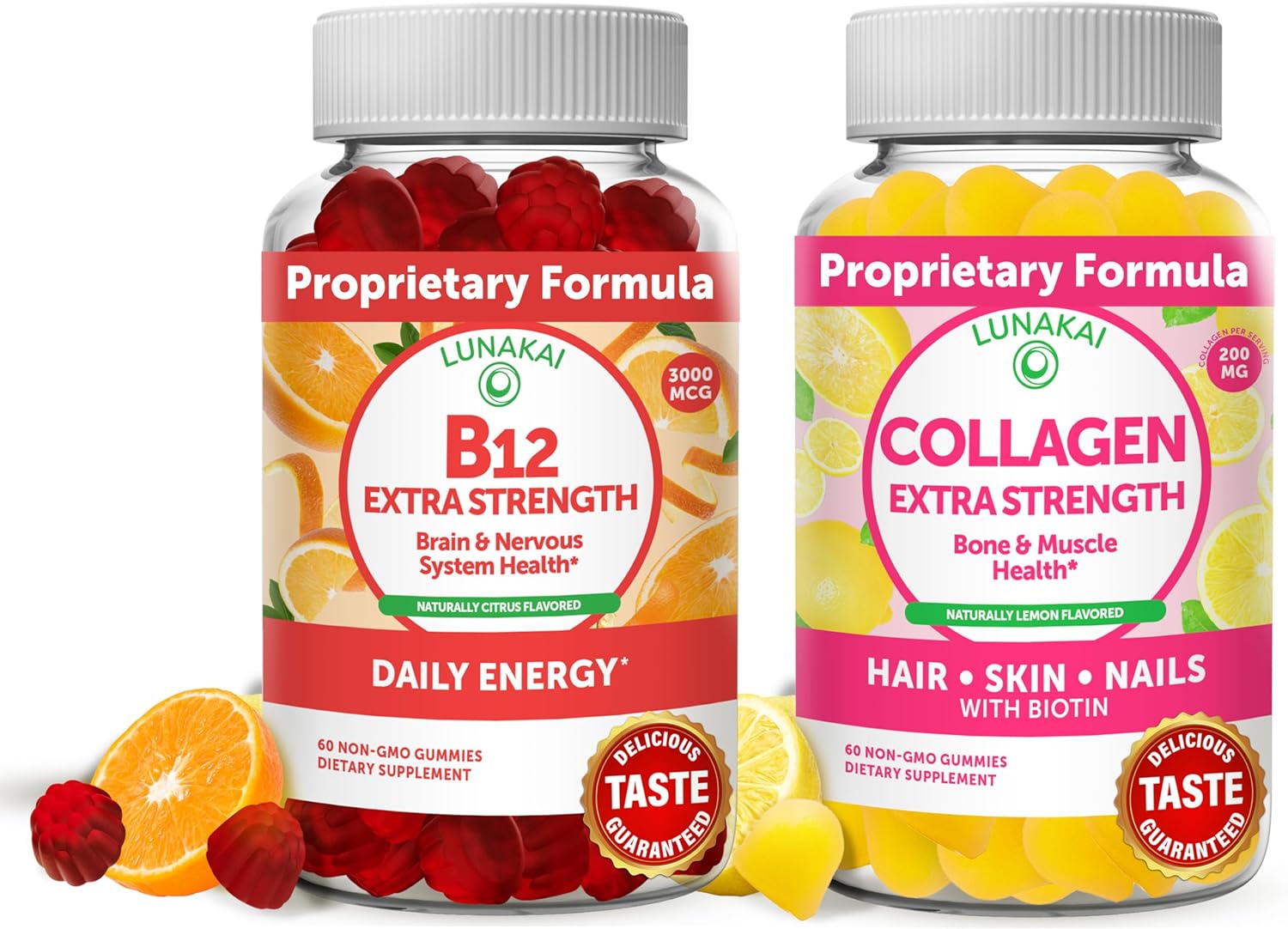 Vitamin B12 And Collagen Gummies Bundle - Non-Gmo, Gluten Free, No Corn Syrup, All Natural Supplements- 60 Ct Vitamin B12 Gummies And 60 Ct Collagen Gummies - 30 Days Supply