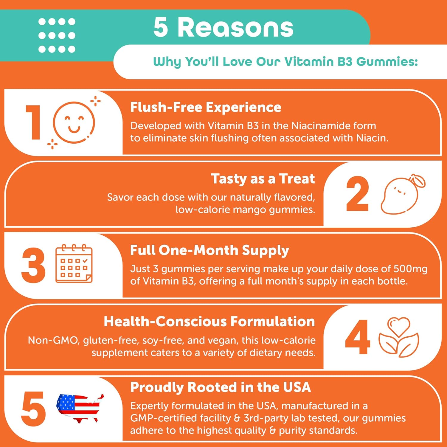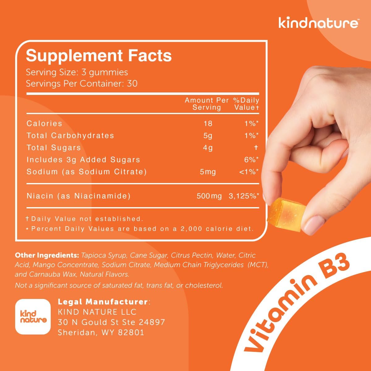 About this item Taste Meets Health β Enjoy our easy-to-take, chewable Niacin gummies, each packed with essential Vitamin B3 in a low-calorie serving. These Niacinamide gummies are carefully formulated to ensure they don't stick together, providing a convenient & enjoyable experience Flush-Free Formula β Each Kind Nature Niacin supplement gummy delivers 500mg of Vitamin B3 as Niacinamide, providing an effective dose for your wellness without the uncomfortable flush often associated with other forms of Niacin Triple The Goodness β With a flavor this irresistible, one mango gummy just isn't enough. Enjoy 3 delicious Niacinamide B3 gummies for a 500mg serving, savoring more of the tropical bliss with each bite. Plus, each bottle provides a full month's supply Mindfully Crafted Formula β Our Niacinamide vitamin gummies cater to a wide range of dietary needs & preferences. They're vegan, non-GMO, soy-free, gluten-free & low in calories, ensuring a guilt-free, delicious experience Quality & Purity Assured β Your wellbeing is our top priority which is why our Vitamin B3 Niacinamide gummies are thoughtfully formulated in the USA, manufactured in a GMP-certified facility & 3rd-party lab tested for purity & potency See more product details,Taste Meets Health β Enjoy our easy-to-take, chewable Niacin gummies, each packed with essential Vitamin B3 in a low-calorie serving. These Niacinamide gummies are carefully formulated to ensure they don't stick together, providing a convenient & enjoyable experience,Flush-Free Formula β Each Kind Nature Niacin supplement gummy delivers 500mg of Vitamin B3 as Niacinamide, providing an effective dose for your wellness without the uncomfortable flush often associated with other forms of Niacin,Triple The Goodness β With a flavor this irresistible, one mango gummy just isn't enough. Enjoy 3 delicious Niacinamide B3 gummies for a 500mg serving, savoring more of the tropical bliss with each bite. Plus, each bottle provides a full month's supply,Mindfully Crafted Formula β Our Niacinamide vitamin gummies cater to a wide range of dietary needs & preferences. They're vegan, non-GMO, soy-free, gluten-free & low in calories, ensuring a guilt-free, delicious experience,Quality & Purity Assured β Your wellbeing is our top priority which is why our Vitamin B3 Niacinamide gummies are thoughtfully formulated in the USA, manufactured in a GMP-certified facility & 3rd-party lab tested for purity & potency