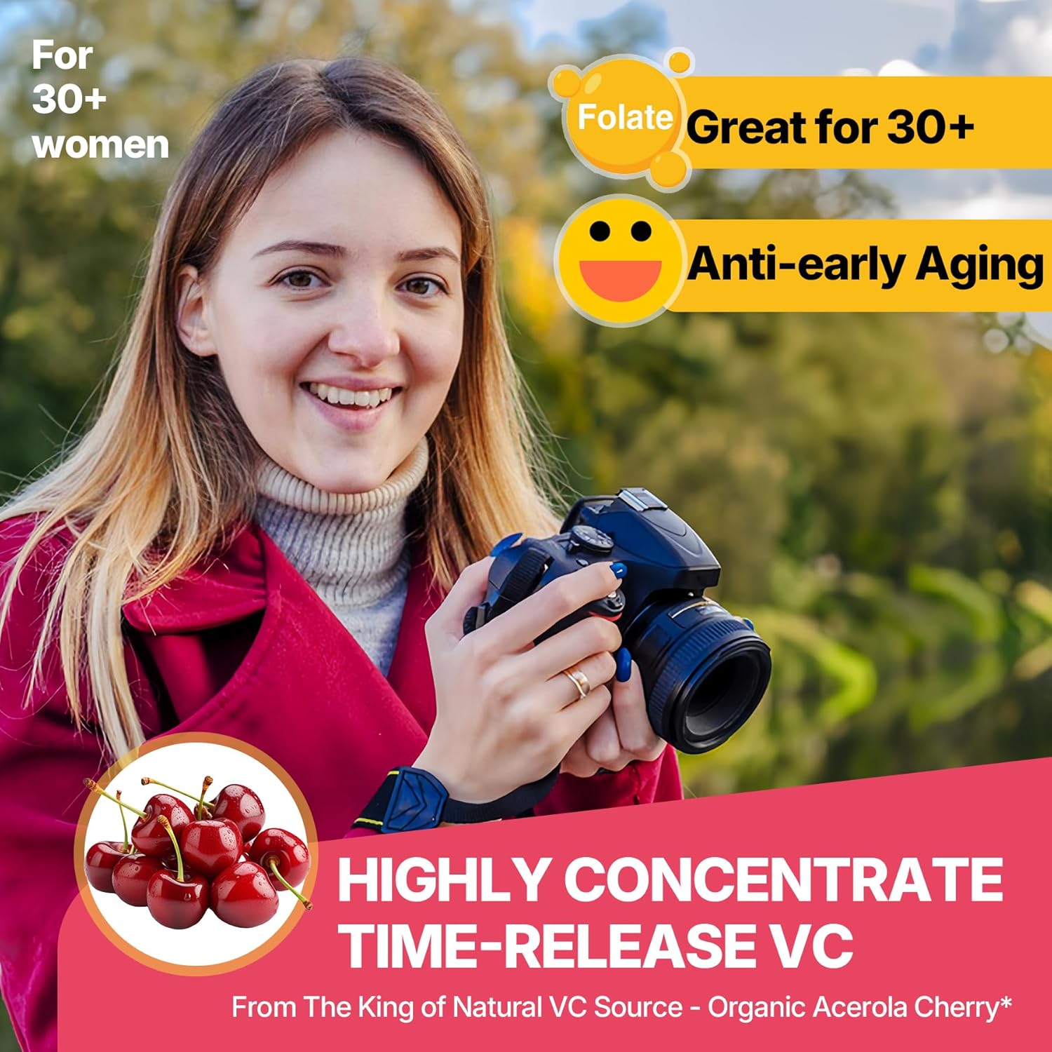 [For Women in 30s] Your 30s often bring new challenges, from career to family. The added Folate is essential for women of this age, preparing your body for future needs. Hyaluronic Acid, Vitamin E, and Copper to keep hydrated and radiant. The immune-boosting of Aronia Berry, Emblic (fruit) and CoQ10 provides the energy you need to power through your day. Whether you’re a busy professional or a multitasking mom, offer the perfect balance of beauty, energy, and immune support to help you thrive
