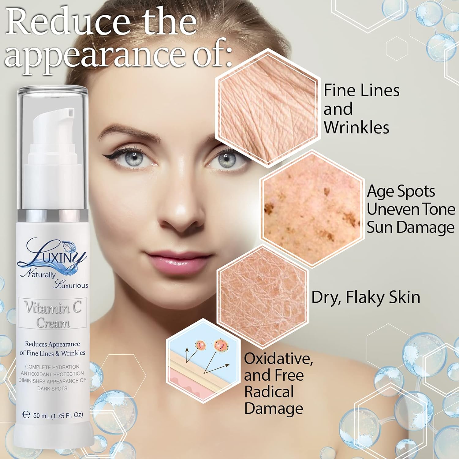 ACHIEVE A HEALTHIER COMPLEXION. Vitamin C is essential for overall skin health. Our vitamin C for skin is a wrinkle reducer. Our pure formula contains Jojoba Oil for the skin; a unique anti aging moisturizer for the face because it absorbs quickly avoiding the greasy residue other oils leave behind. Squalane oil, derived from olives is added to fight free radical damage & target uneven skin tone to reveal a healthier complexion A LITTLE GOES A LONG WAYOur face lotion for women & men comes with a convenient airless pump to dispense just the right amount. Cleanse with Luxiny face wash, use your favorite Luxiny serum then apply 1-3 pumps of the moisturizing face cream to face, neck & around eyes to meet your skin’s daytime & nighttime hydration needs. Replacing your current moisturizer with our daily face moisturizer saves you money by eliminating the need for additional, often expensive, eye cream, night cream & day LEAVES YOUR SKIN FEELING SOFT AND SILKY. Our lightweight Vitamin C face cream is well known for its ability to seek out areas of uneven skin tone, patches of dry skin & sun damaged skin to deliver deep penetrating restorative moisture. Our topical Vitamin C for the face treats signs of aging while offering antioxidant protection to help prevent further damage caused by the sun* & other environmental pollutants. It’s antiaging skin care that will leave you looking and feeling amazing!Vitamin C Moisturizer for Face & Neck, Anti Wrinkle Face Cream for Women Anti-Aging Lotion with Jojoba Oil, a Day or Night Cream Moisturizer for Reducing Hyperpigmentation plus Antioxidant Protection