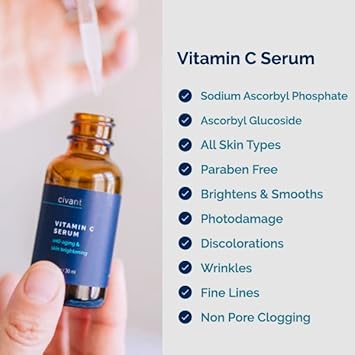 About this item Simple, Clean, Effective Skin Care: Civant Vitamin C Serum has combined two forms of Vitamin C (Sodium Ascorbyl Phosphate and Ascorbyl Glucoside) to form our powerful facial serum that can help reduce the appearance of photodamage, fine lines, and wrinkles. Suitable for all skin types and tones. Powerful Ingredients, Simple Regimens: When used daily, vitamin C brightens and evens the skin and improves hydration. We've combined the key ingredients of sea buckthorn fruit, hyaluronic acid, and vitamin C & E to deliver a face serum that hydrates and smooths your skin with no irritation. Anti-aging & Skin Brightening Benefits: A skin brightening formula designed to reduce the appearance of wrinkles and dark spots, help boost collagen production, smooth wrinkles, reduce hyperpigmentation, hydrate the skin, and diminish the appearance of scars. Radiant Results: Complete your cleansing routine before applying our Vitamin C Serum to your face, and allow your skin to absorb the serum before applying moisturizer to boost the radiance of your skin and get the glow you've always wanted. Trusted For Over 20 Years: Our philosophy is simple - to create effective products that you can feel good about putting on your skin. All of our formulas are cruelty-free and vegan. We don't use parabens, mineral oil, petrolatum, sulfates, or phthalates. Made in the USA. › See more product details,Simple, Clean, Effective Skin Care: Civant Vitamin C Serum has combined two forms of Vitamin C (Sodium Ascorbyl Phosphate and Ascorbyl Glucoside) to form our powerful facial serum that can help reduce the appearance of photodamage, fine lines, and wrinkles. Suitable for all skin types and tones,Powerful Ingredients, Simple Regimens: When used daily, vitamin C brightens and evens the skin and improves hydration. We've combined the key ingredients of sea buckthorn fruit, hyaluronic acid, and vitamin C & E to deliver a face serum that hydrates and smooths your skin with no irritation,Anti-aging & Skin Brightening Benefits: A skin brightening formula designed to reduce the appearance of wrinkles and dark spots, help boost collagen production, smooth wrinkles, reduce hyperpigmentation, hydrate the skin, and diminish the appearance of scars,Radiant Results: Complete your cleansing routine before applying our Vitamin C Serum to your face, and allow your skin to absorb the serum before applying moisturizer to boost the radiance of your skin and get the glow you've always wanted,Trusted For Over 20 Years: Our philosophy is simple - to create effective products that you can feel good about putting on your skin. All of our formulas are cruelty-free and vegan. We don't use parabens, mineral oil, petrolatum, sulfates, or phthalates. Made in the USA
