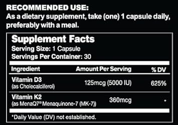 Features D3 vitamin 5000 iu and 360mcg K2 vitamin as Menaquinone-7 per capsule. Vitamin d assists with calcium absorption and vitamin k with heart and artery health. D3 with K2 works together to improve both of these for total health