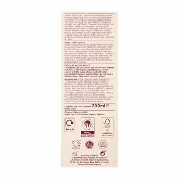 Product Information:Superdrug Vitamin E Hot Cloth Cleanser Is Suitable For Removing Dirt And Makeup,Features:Easy To Use Tube And Reusable Muslin Cloth,Benefit:Dermatologically Approved. Suitable For Vegetarians And Vegans. Rich In Natural Vitamin E,Warning Or Restrictions:Avoid Direct Contact With The Eyes. If This Should Occur Rinse Thoroughly With Clean Water,Product Specification:Aqua, Caprylic/Capric Triglyceride, Theobroma Cacao (Cocoa) Seed Butter, Cetearyl Alcohol, Glycerin, Polysorbate 60, Sorbitan Stearate, Cetyl Alcohol, Propylene Glycol, Prunus Amygdalus Dulcis Oil, Parfum, Tocopheryl Acetate, Tocopherol (Vitamin E), Panthenol, Alcohol Denat., Peg-35 Castor Oil, Polysorbate 20, Aesculus Hippocastanum (Horse Chestnut) Seed Extract, Retinyl Palmitate (Vitamin A), Inositol, Calcium Pantothenate (Vitamin B), Linoleic Acid (Vitamin F), Biotin (Vitamin H), Potassium Hydroxide, Sodium Benzoate, 2-Bromo-2-Nitropropane-1,3-Diol, Citric Acid, Coumarin, Linalool, Buthylphenyl Methylpropional, Alpha-Isomethyl Ionone, Disodium Edta,Product Uses:Gently Massage The Creamy Cleanser Into Your Neck And Face Using Circular Movements. Rinse The Muslin Cloth In Hand Hot Water And Wring Out Before Polishing Off The Cleanser, Taking Care Around The Delicate Eye Area. Give Your Face A Splash Of Cool Water And Pat Dry With A Towel To Finish The Process. Rinse Cloth After Every Use And Allow To Dry Naturally