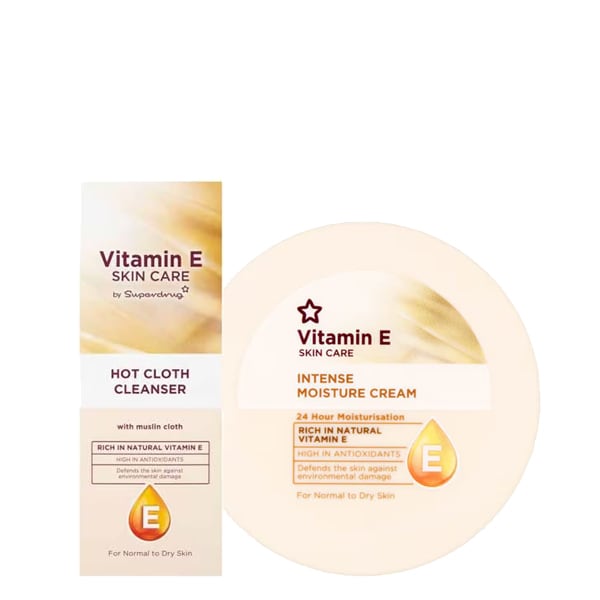 Gently Cleanse Away Dirt And Makeup And Nourish With An Intensive Vitamin E Moisturiser Bundle Includes: Superdrug Vitamin E Hot Cloth Cleanser 200Ml Superdrug Vitamin E Int Moisture Cream 100Ml Included In This Bundle: Superdrug Vitamin E Hot Cloth Cleanser 200Ml 1 814801 Superdrug Vitamin E Int Moisture Cream 100Ml Superdrug Vitamin E Int Moisture Cream 100Ml