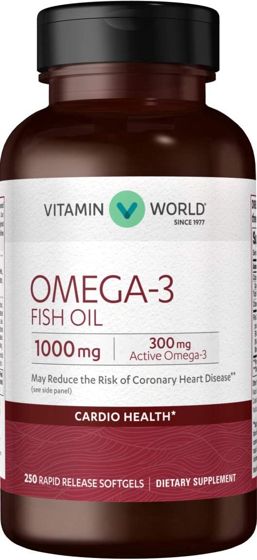 DESCRIPTION : Vitamin World Omega-3 Fish Oil 1000 mg. 250 Softgels, EPA DHA, Heart Health, Cardio Support, Rapid-Release, Gluten Free