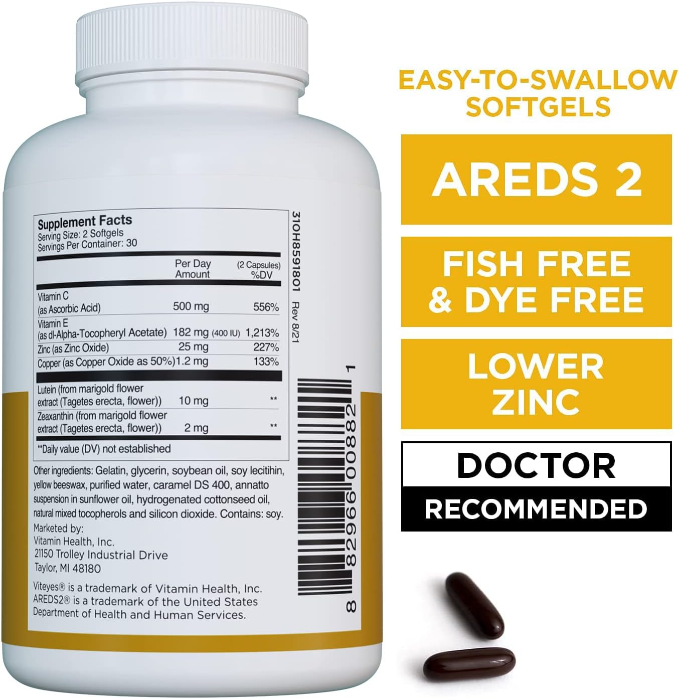 DESCRIPTION : Viteyes AREDS 2 Classic Macular Health Formula Softgels, Eye Health Vitamin for Vision Protection, Lower Zinc, Eye Vitamins, Macular Vitamins, Beta-Carotene Free, 60 Softgels