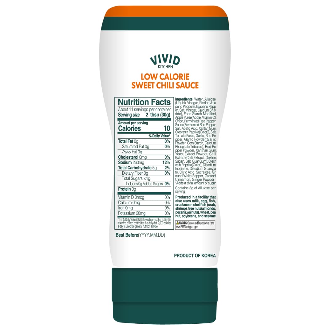 About this item Sweet Meets Spicy Perfection – A balanced sweet chili flavor with a mild heat, ideal for dipping, stir-fry, glazing, or drizzling over rice and noodles. Low Sugar, Just 10 Calories – Sweetened with allulose, this sauce offers the same delicious flavor with less sugar and only 10 calories per serving. No Preservatives or MSG – Crafted with clean, natural ingredients, free from artificial preservatives and MSG. Easy-Squeeze, No-Mess Bottle – Each 11.33 oz bottle is designed for quick, clean, and convenient use in the kitchen or on the go. Versatile Everyday Staple – Adds a flavorful kick to meats, spring rolls, dumplings, grilled veggies, and more—perfect for elevating everyday meals. Sweet Chili Sauce: A perfect balance of sweet and spicy, this sauce is ideal for dipping, glazing meats, or adding to stir-fries for an extra kick of flavor. See more product details,Sweet Meets Spicy Perfection – A balanced sweet chili flavor with a mild heat, ideal for dipping, stir-fry, glazing, or drizzling over rice and noodles,Low Sugar, Just 10 Calories – Sweetened with allulose, this sauce offers the same delicious flavor with less sugar and only 10 calories per serving,No Preservatives or MSG – Crafted with clean, natural ingredients, free from artificial preservatives and MSG,Easy-Squeeze, No-Mess Bottle – Each 11.33 oz bottle is designed for quick, clean, and convenient use in the kitchen or on the go,Versatile Everyday Staple – Adds a flavorful kick to meats, spring rolls, dumplings, grilled veggies, and more—perfect for elevating everyday meals,Sweet Chili Sauce: A perfect balance of sweet and spicy, this sauce is ideal for dipping, glazing meats, or adding to stir-fries for an extra kick of flavor