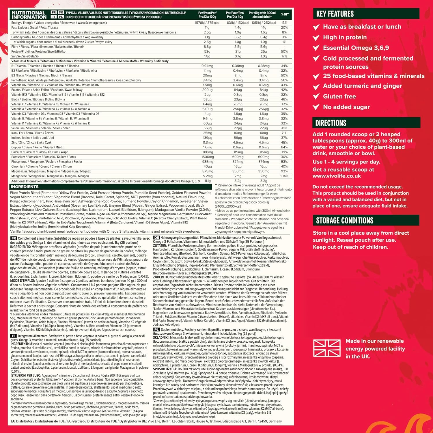 About this item NOURISHING - Have as breakfast or lunch to nourish your body. With 21g plant protein and 5 billion gut friendly bacteria per serving. Also includes natural electrolytes for recovery. With a low calorie base, so you can adapt to suit your needs WITH ESSENTIAL VITAMINS & MINERALS Contains 25 vital vitamins and minerals from plant-based sources (including zinc, selenium, calcium, magnesium, vitamins C, D3, B6, B12), omegas 3, 6 and 9, turmeric and digestive enzymes. NO ARTIFICIAL INGREDIENTS - No artificial sweeteners, flavours, colors or preservatives. No added sugar, gluten free and certified 100% vegan by The Vegan Society. QUALITY GUARANTEED - Third party tested for heavy metals, pesticides and herbicides. Manufactured sustainably in the UK. VIVO LIFE - We seek out the highest quality, most sustainable, nutrient-dense and plant-based ingredients to help you do nutrition, wellbeing and life differently. See more product details,NOURISHING - Have as breakfast or lunch to nourish your body. With 21g plant protein and 5 billion gut friendly bacteria per serving. Also includes natural electrolytes for recovery. With a low calorie base, so you can adapt to suit your needs,WITH ESSENTIAL VITAMINS & MINERALS Contains 25 vital vitamins and minerals from plant-based sources (including zinc, selenium, calcium, magnesium, vitamins C, D3, B6, B12), omegas 3, 6 and 9, turmeric and digestive enzymes,NO ARTIFICIAL INGREDIENTS - No artificial sweeteners, flavours, colors or preservatives. No added sugar, gluten free and certified 100% vegan by The Vegan Society,QUALITY GUARANTEED - Third party tested for heavy metals, pesticides and herbicides. Manufactured sustainably in the UK,VIVO LIFE - We seek out the highest quality, most sustainable, nutrient-dense and plant-based ingredients to help you do nutrition, wellbeing and life differently