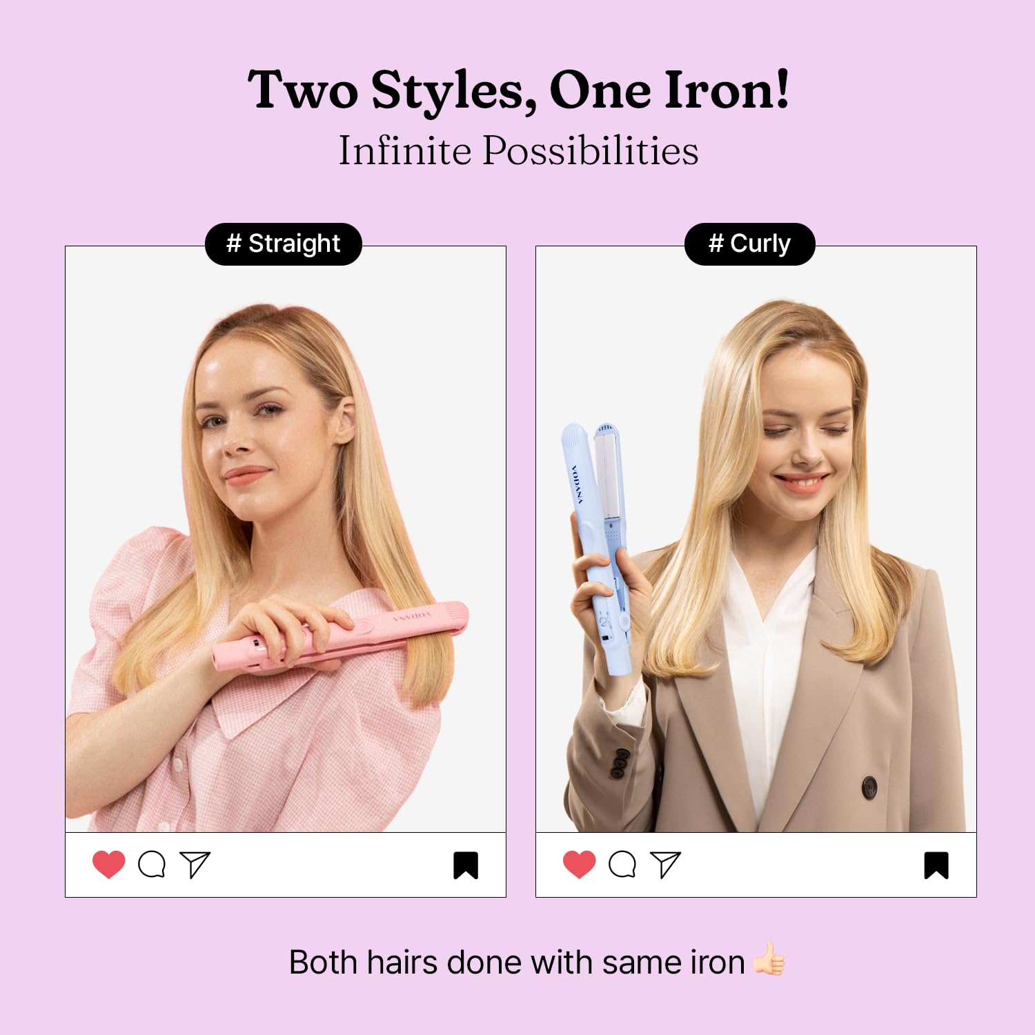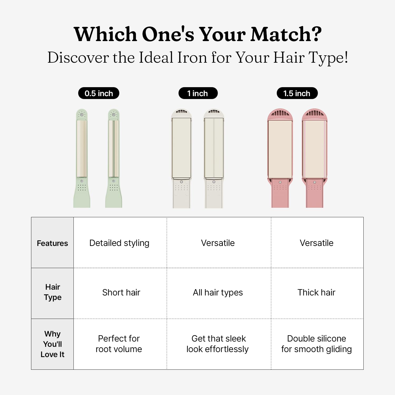 About this item Sleek, Chic, and Oh-So-Smart: Say hello to our genius patented silicone bar that puffs up with heat to cradle your hair in protection. And with our flexi-plates, you can switch from poker-straight to big-night-out volume without breaking a sweat—or your hair Your Hair's New Bestie: Our ceramic-coated plates are the guardians of your hair's health, with a patented silicone bar that ensures every strand is treated like royalty. Say goodbye to damage and hello to hair that's smooth and free from crimps Tailored to You: Your hair, your rules. Whether it's the 1.5-inch for those gorgeous curls, the 1-inch for everyday glam, or the 0.5-inch for detail work, we've got the perfect size for your unique style. And for those with shorter locks Our 0.5-inch has got your back Quick Heat Control at Your Fingertips: Get the custom heat you need in a flash, and never worry about leaving your flat iron on again with our smart auto shut-off feature. Plus, our travel-friendly voltage means you can take your style global Unlimited Style, Just Switch It Up!: Step out with a new vibe every day and let your hair do the talking! Glide to a sleek straight with a smooth pass, twirl a flirty C-curl, sculpt a sophisticated S-wave, or boost your roots for voluminous oomph—our flat iron is the magic wand for your hair's every whim. With intuitive design and versatile heat settings, switch up your look with the same ease you change your outfit See more product details,Sleek, Chic, and Oh-So-Smart: Say hello to our genius patented silicone bar that puffs up with heat to cradle your hair in protection. And with our flexi-plates, you can switch from poker-straight to big-night-out volume without breaking a sweat—or your hair,Your Hair's New Bestie: Our ceramic-coated plates are the guardians of your hair's health, with a patented silicone bar that ensures every strand is treated like royalty. Say goodbye to damage and hello to hair that's smooth and free from crimps,Tailored to You: Your hair, your rules. Whether it's the 1.5-inch for those gorgeous curls, the 1-inch for everyday glam, or the 0.5-inch for detail work, we've got the perfect size for your unique style. And for those with shorter locks Our 0.5-inch has got your back,Quick Heat Control at Your Fingertips: Get the custom heat you need in a flash, and never worry about leaving your flat iron on again with our smart auto shut-off feature. Plus, our travel-friendly voltage means you can take your style global,Unlimited Style, Just Switch It Up!: Step out with a new vibe every day and let your hair do the talking! Glide to a sleek straight with a smooth pass, twirl a flirty C-curl, sculpt a sophisticated S-wave, or boost your roots for voluminous oomph—our flat iron is the magic wand for your hair's every whim. With intuitive design and versatile heat settings, switch up your look with the same ease you change your outfit