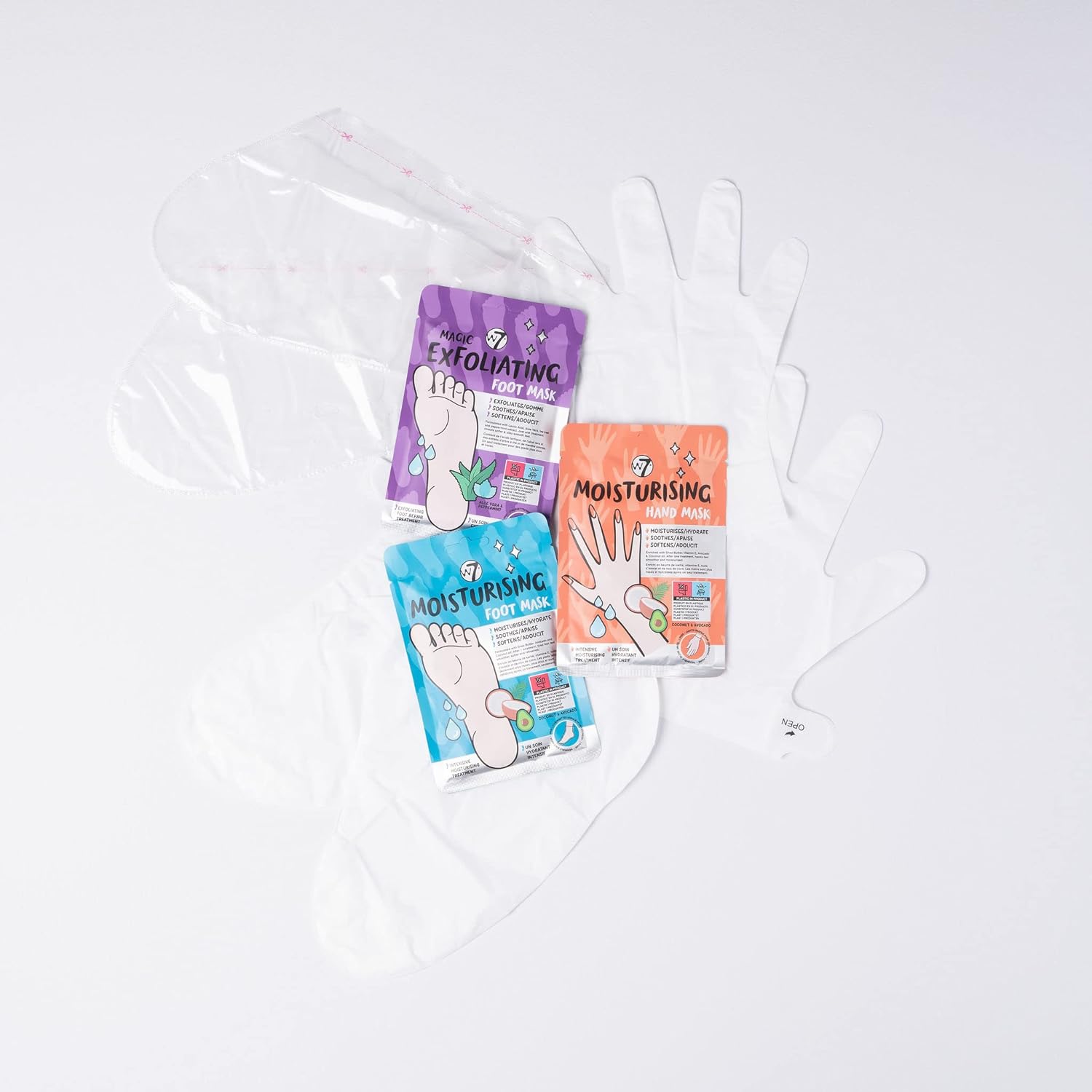 HYDRATE & RENEW - The Moisturizing Hand & Feet Masks are enriched with a luxurious serum of Shea Butter, Vitamin E and Coconut Oil to help treat, exfoliate and moisturize hard, sore and tired feet and hands. The perfect partners for your skin and bodycare kit!SOOTHE & EXFOLIATE - Refresh, revive and hydrate neglected hands, feet, nails and skin with these skin-loving ingredients that help boost circulation and support skin health. Make dry or chapped fingers and toes smoother and beautifully soft. Get irresistible looking hands and feet after just one use with this gentle formula!HOW TO USE - Slip one sock mask onto each foot & slip one glove mask onto each hand. Lay back and relax and leave on for 20-30 minutes. Remove the masks and massage the excess essence into the hands and feet letting it naturally absorb into your skin. Feel the difference instantly with this easy processPROFESSIONAL QUALITY - W7 Cosmetics are designed in London by professionals. All our skincare products are safe on sensitive skin. Ideal for men & women and teens of all ages & anyone who loves high quality cosmetics