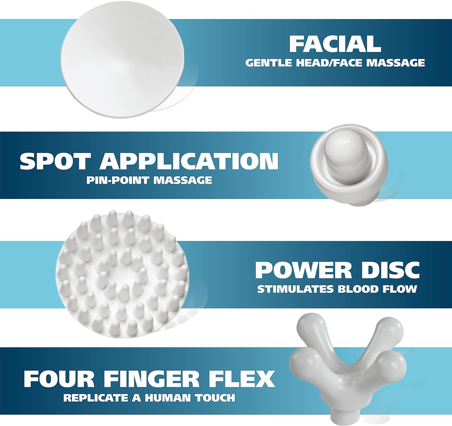 5 >4 attachments include: Facial-smooth for a gentle massage, 4 finger flex with finger-like nodes, Power Disc-a a large surface area massaging, Spot application for digging into pinpoint pain areas
