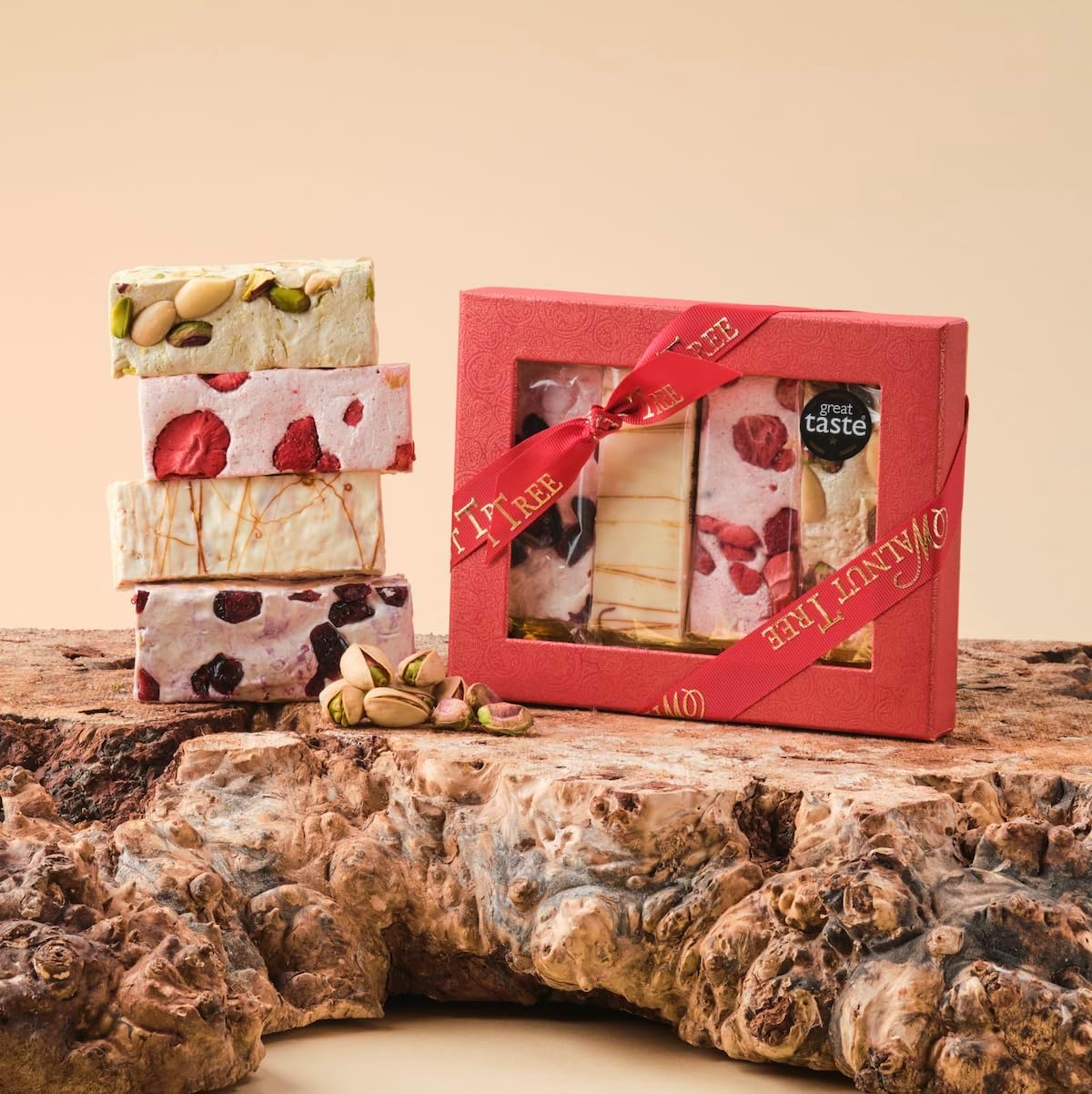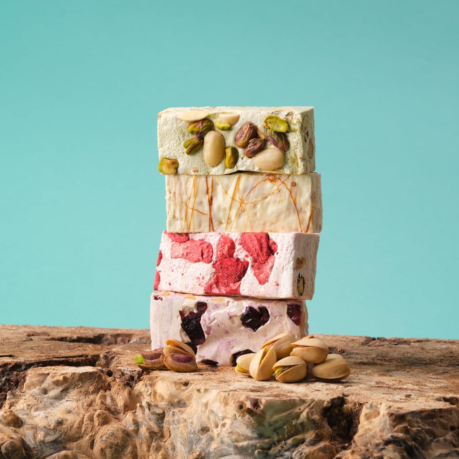 FLAVOURFUL ARTISAN SELECTION: Four honeyed nougat bars featuring pistachio, salted caramel, cranberry, and strawberry—hand-packed for an indulgent gift or a refined sweet treat