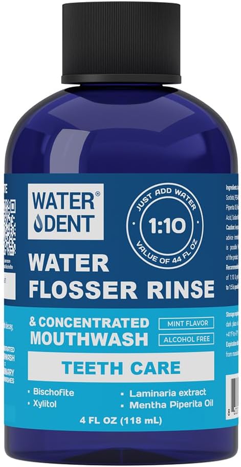 WATER DENT Water Flosser Rinse, IRRIGANT, Concentrate Mouthwash 1:10 = 44 fl.oz, Travel Size, Add to Water Flosser, Mint Flavor, Alcohol Free, Fluoride Free