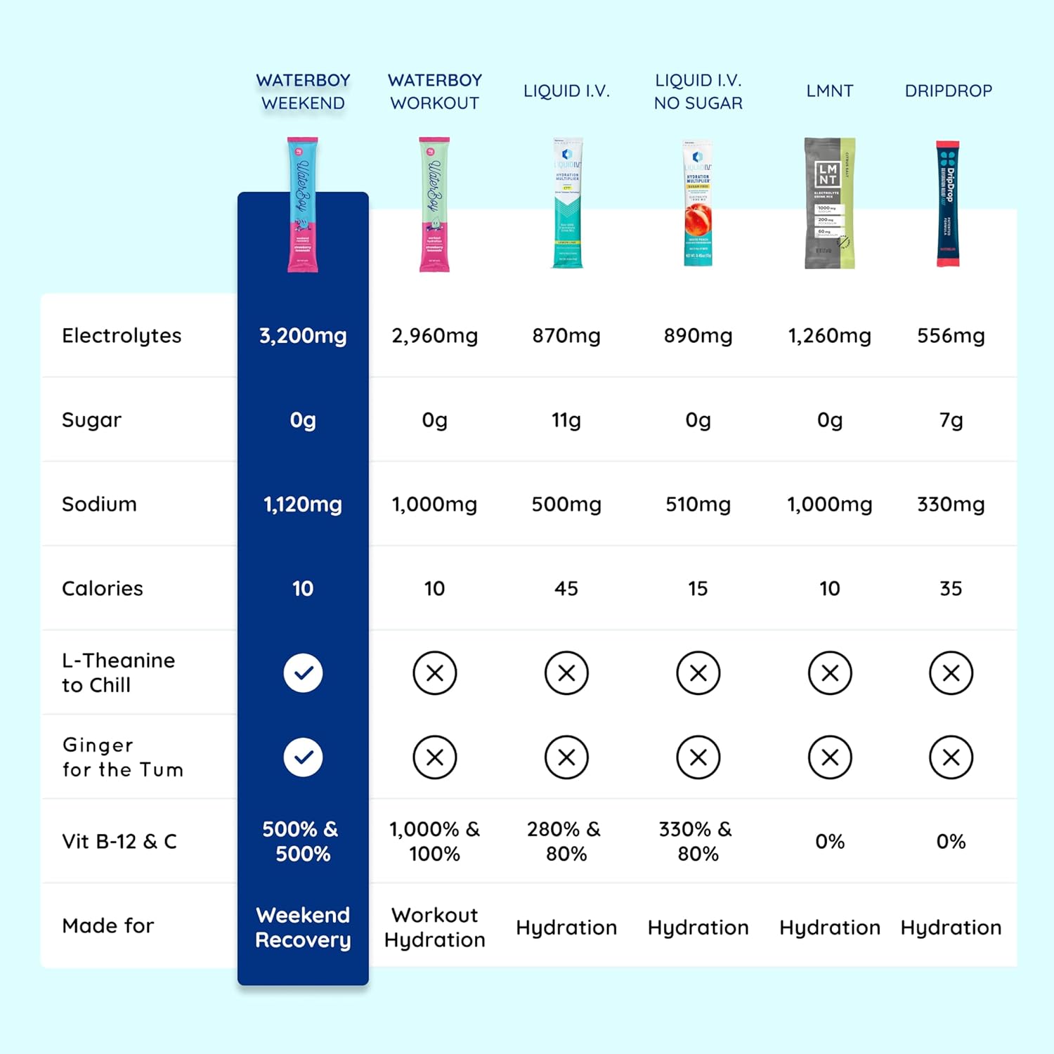 MADE FOR ADULTS: Most electrolyte mixes and electrolyte drinks on the market are made for kids, general hydration or sports or and are LOADED with sugar. Waterboy weekend recovery is made specifically to help adults. Waterboy includes L-theanine, ginger and vitamins to help you bounce back faster