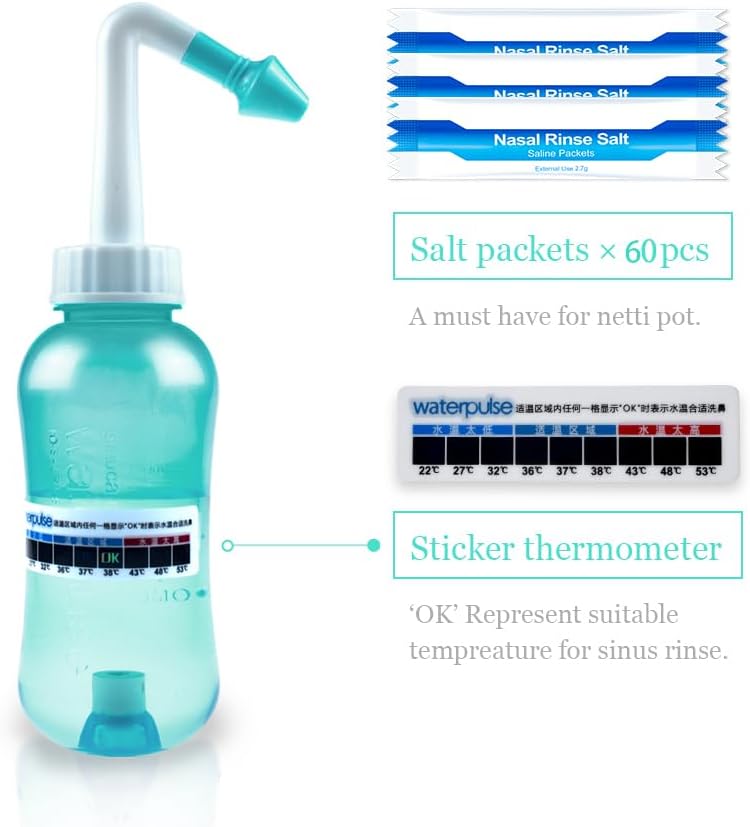 Waterpulse Neti Pot Sinus Rinsing, Nasal Wash Bottle Sinus Rinsing Bottle Cleaner Pressure Irrigation Neti-Pot With Sticker Thermometer For Adult & Kid Bpa Free (Green)