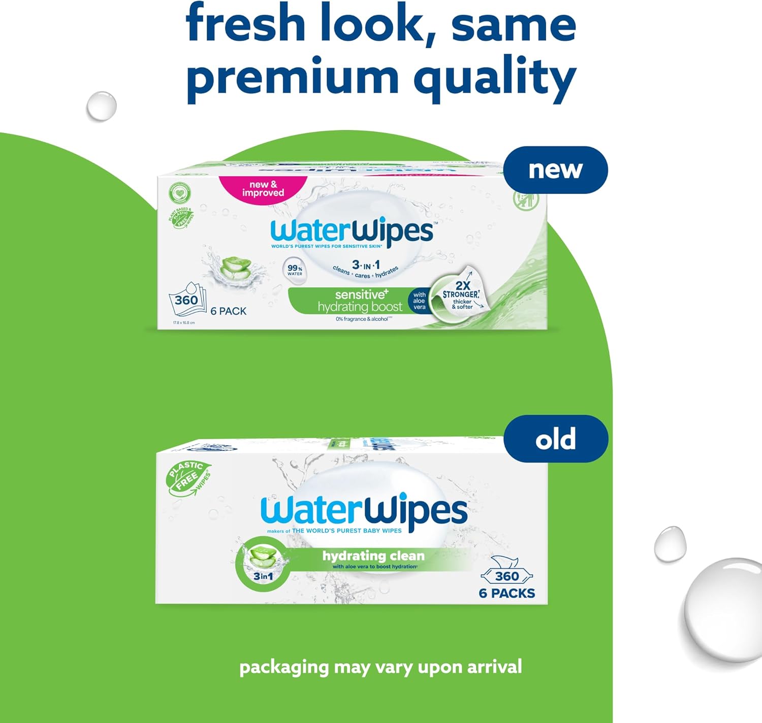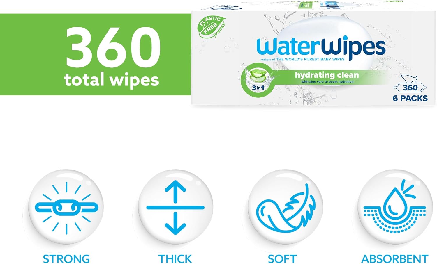 Waterwipes Hydrating Clean Baby Wipes, 360 Count (6 Packs), 99% Water-Based Wipes With Aloe Vera, Unscented, Packaging May Vary