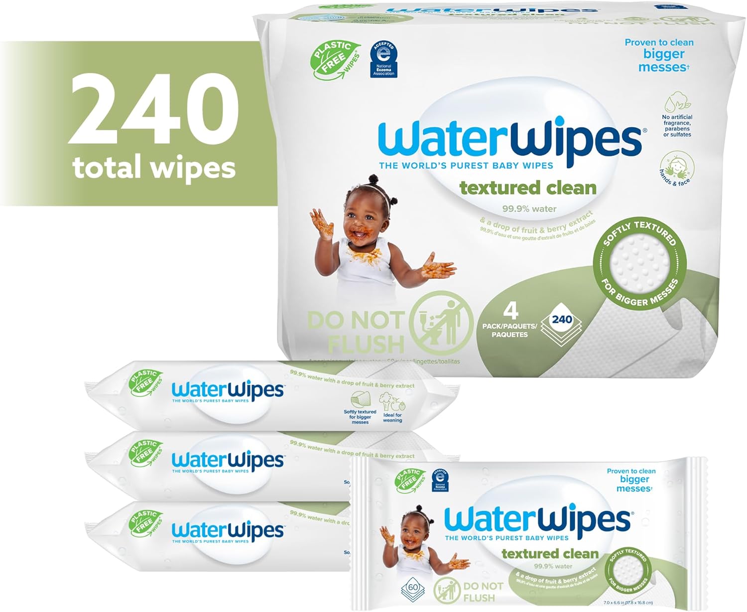 Waterwipes Plastic-Free Textured Clean, Toddler & Baby Wipes, 99.9% Water Based Wipes, Unscented & Hypoallergenic For Sensitive Skin, 60 Count (Pack Of 4), Packaging May Vary