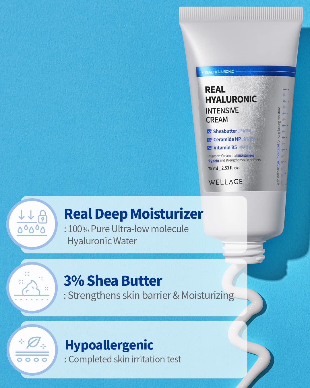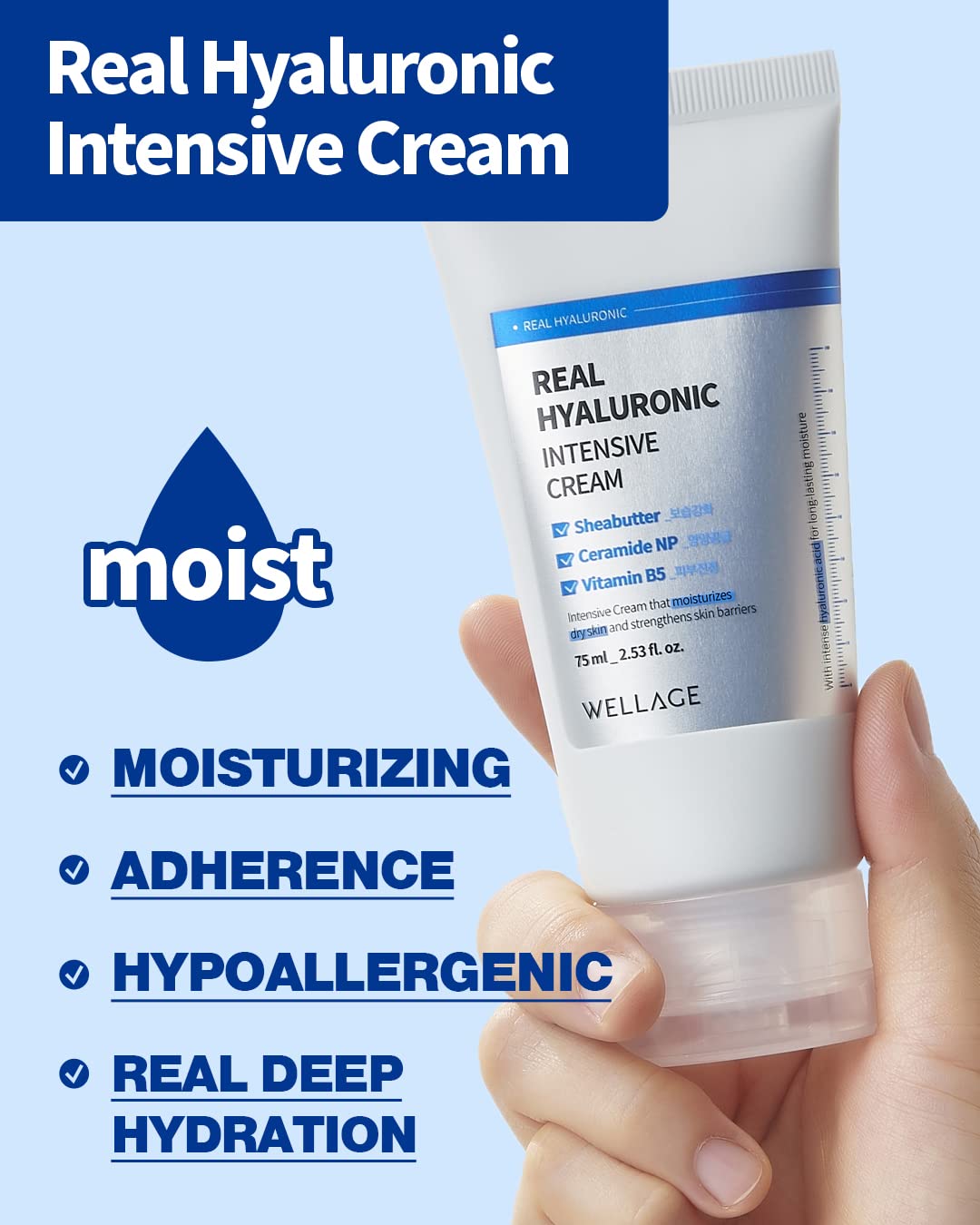 Wellage Real Hyaluronic Intensive Cream 75Ml (2.5 Fl.Oz), Intensive Moisturizing Cream With Hyaluronic Acid And Shea Butter, Rich Cream Facial Gel, Skin Barrier Strengthening For Damaged Skin