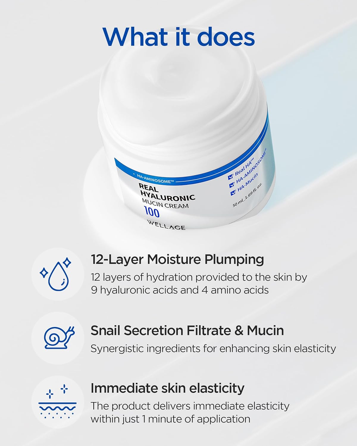 Pure Hyaluronic Acid And Snail Mucin: Experience The Magic Of Korean Skincare With Wellage Real Hyaluronic Mucin Cream. This Face Moisturizer Combines 100% Pure, Triple-Refined Hyaluronic Acid And Nourishing Snail Mucin To Enhance Skin Hydration And Restore Elasticity, Providing A Plump, Youthful Complexion
