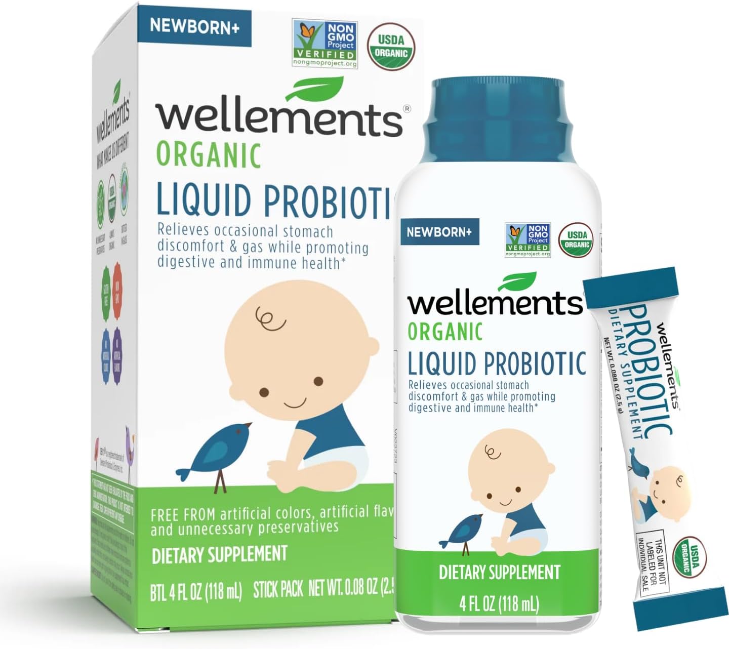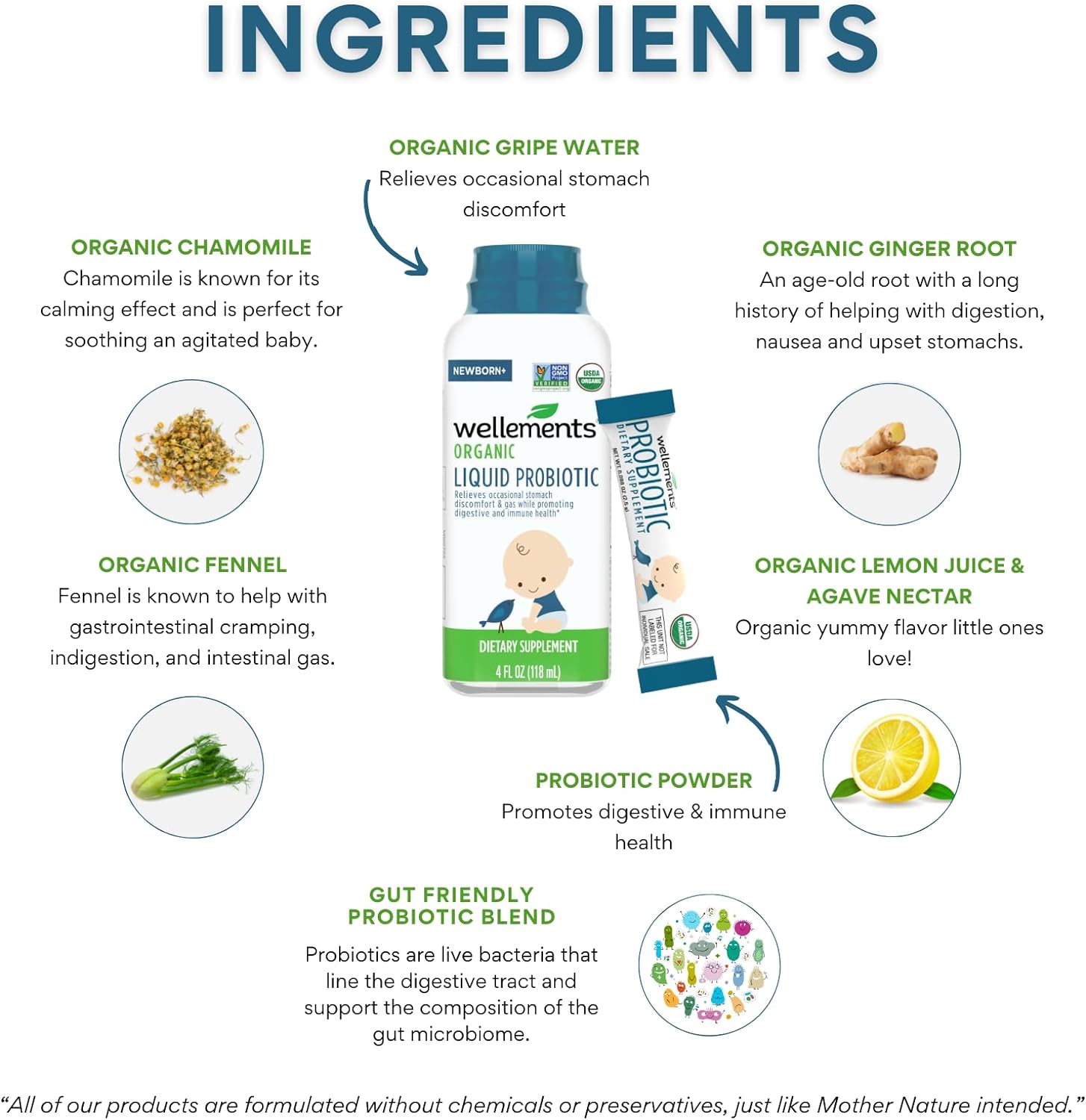 Wellements Certified USDA Organic Liquid Probiotic 4 Fl Oz, Gripe Water & Probiotics for Infant Digestion & Immune Health, Relief for Gas, Colic & Hiccups, Free from Dyes, Parabens, Preservatives