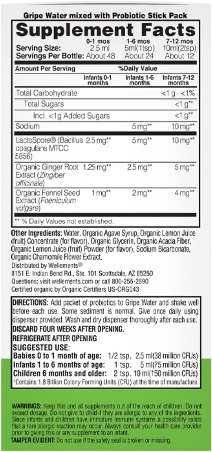 GRIPE WATER + PROBIOTICS – Organic Gripe Water combined with Organic Probiotics safely ease occasional stomach discomfort and gas, often associated with baby colic, fussiness, and hiccups while promoting a healthy gut, digestion and immune system10MADE FOR NEWBORNS – Our liquid probiotic for newborns is made from a safe and effective certified organic herbal blend of chamomile, fennel, ginger root and gut friendly probiotics. Works great for older babies too!10EASY TO USE – With the included dispenser and the yummy lemon flavor, our liquid probiotic is an easy to administer infant daily probiotic supplement. Infants 0-1 month: ½ tsp. (2.5 ml) Babies 1-6 months: 1 tsp. (5 ml) 6 months and older: 2 tsp. (10 ml)10CERTIFICATIONS – We are proud to be USDA Certified Organic, Gluten Free & Non GMO plus all of our products are FREE FROM Unnecessary Preservatives, Artificial Colors, Artificial Flavors and the Top 9 Most Common Allergens10WELLEMENTS – SIMPLY A BETTER TOMORROW. We are parents supporting parents by providing everything we can to help. You do the hard work of parenting — we’ll do the work to ensure providing clean products for your little one is the easiest part