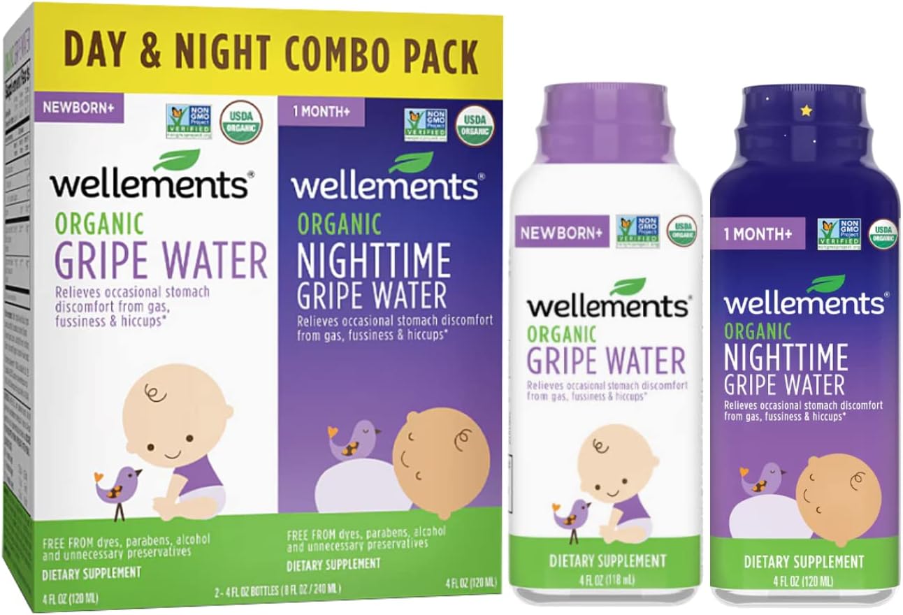 Wellements Organic Baby Gripe Water Day & Night Combo Pack | Relief for Occasional Upset Bellies from Baby Gas, Colic, Hiccups & Fussiness, Gentle*, USDA Certified Organic | Pack of 2, 4 Fl Oz