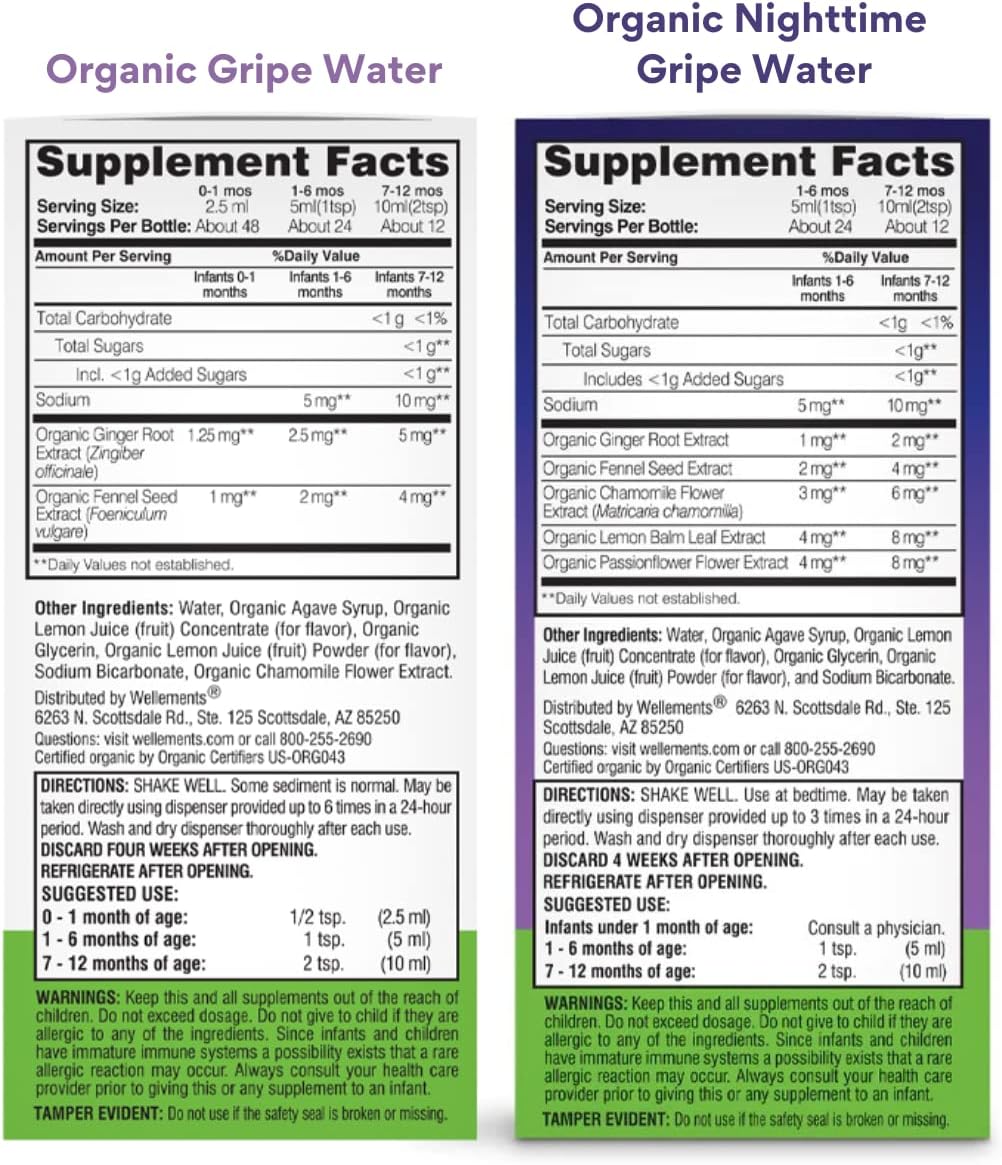 HAPPY BELLIES β Our certified Organic Gripe Water for babies relieves occasional stomach discomfort from gas, colic, fussiness & hiccups* while our Organic Nighttime Gripe Water also helps to promote a peaceful night's sleep10SAFE & FAST ACTING β Our gripe waters are made with only USDA certified ingredients and are gentle on little bellies. Typically our gripe waters start providing relief immediately but may take up to 20 minutes10HOW TO USE β Shake well before each use. Some sediment is normal. May be taken directly using the dispenser provided. Wash and dry dispenser thoroughly after each use. See package for dosage and additional instructions10CERTIFICATIONS β We are proud to be USDA Certified Organic, Gluten Free & Non GMO. All of our products are FREE FROM Artificial Colors, Artificial Flavors & the Top 9 Most Common Allergens10WELLEMENTS β SIMPLY A BETTER TOMORROW. You do the hard work of parenting β weβll do the work to ensure providing clean products for your little one is the easiest part